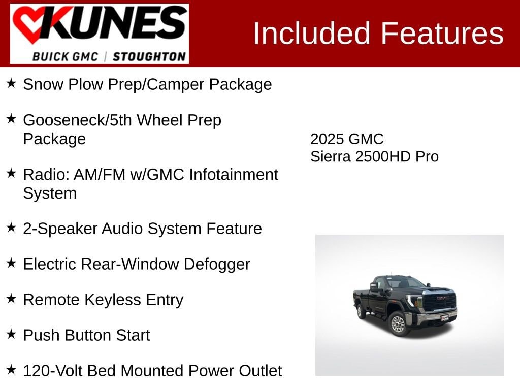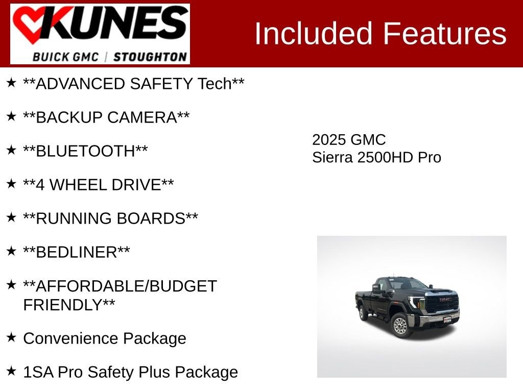 2025 GMC Sierra 2500HD Pro 6.6L V8 **ADVANCED SAFETY Tech**, **BACKUP CAMERA**, **BLUETOOTH**, **4 WHEEL DRIVE**, **RUNNING BOARDS**, **BEDLINER**, **AFFORDABLE/BUDGET FRIENDLY**, 10-Speed Automatic, 4WD, Jet Black Cloth, 120-Volt Bed Mounted Power Outlet, 120-Volt Instrument Panel Power Outlet, 17 Machined Aluminum Wheels, 1SA Pro Safety Plus Package, 2-Speaker Audio System Feature, 220-Amp Alternator, 3.73 Rear Axle Ratio, 4-Wheel Disc Brakes, ABS brakes, Auto-Dimming Inside Rear-View Mirror, Brake assist, Convenience Package, Deep-Tinted Glass, Electric Rear-Window Defogger, EZ Lift Power Lock & Release Tailgate, Gooseneck/5th Wheel Prep Package, Lane Change Alert w/Side Blind Zone Alert, Lane Departure Warning System, LED Cargo Area Lighting, Panic alarm, Perimeter Lighting, Power-Adjustable Black Outside Mirrors, Push Button Start, Radio: AM/FM w/GMC Infotainment System, Rear Cross Traffic Alert, Remote Keyless Entry, Snow Plow Prep/Camper Package, Speed control, Spray-On Pickup Bedliner, Ultrasonic Front & Rear Park Assist.