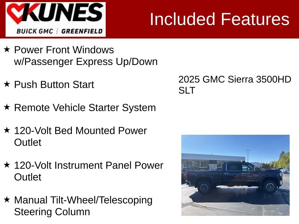 10-Speed Automatic, 4WD, Black Leather, 120-Volt Bed Mounted Power Outlet, 120-Volt Instrument Panel Power Outlet, 2 Charge-Only Rear USB Ports, 2 Charge/Data USB Ports, 2-Speed Active Transfer Case, 6-Speaker Audio System Feature, All-Weather Floor Liners (LPO), Black Front & Rear Molded Splash Guards (LPO), Chrome Surround Grille w/Chrome Insert Bars, Deep-Tinted Glass, Electric Rear-Window Defogger, Front Rain-Sensing Wipers, GMC Protection Package (LPO), Gooseneck/5th Wheel Prep Package, Heated Driver & Front Outboard Passenger Seats, Heated steering wheel, Keyless Open & Start, LED Cargo Area Lighting, Manual Tilt-Wheel/Telescoping Steering Column, Power Front Windows w/Passenger Express Up/Down, Preferred Equipment Group 4SA, Push Button Start, Rain sensing wipers, Rear Wheelhouse Liners, Remote Vehicle Starter System, SiriusXM w/360L Trial Subscription, Spray-On Pickup Bedliner w/GMC Logo, Steering Wheel Audio Controls, Suspension Package, Unauthorized Entry Theft-Deterrent System, Wireless Phone Projection. Titainium 2025 GMC Sierra 3500HD SLT 4WD 10-Speed Automatic Duramax 6.6L V8 Turbodiesel