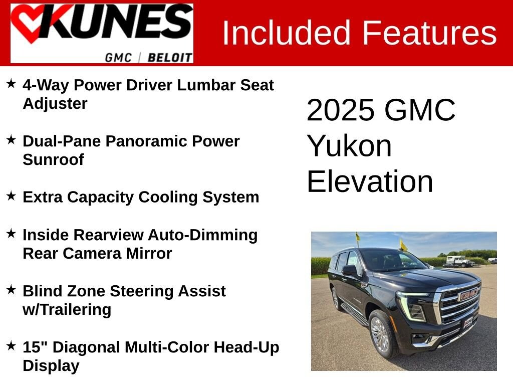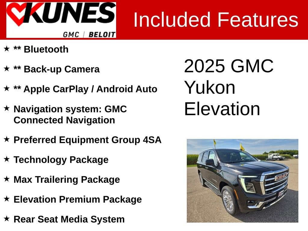 Onyx Black 2025 GMC Yukon Elevation RWD 10-Speed Automatic with Overdrive EcoTec3 5.3L V8 ** Bluetooth, ** Back-up Camera, ** Apple CarPlay / Android Auto, 15 Diagonal Multi-Color Head-Up Display, 4-Way Power Driver Lumbar Seat Adjuster, 4-Way Power Front Passenger Lumbar Seat Adjuster, Blind Zone Steering Assist w/Trailering, Dual-Pane Panoramic Power Sunroof, Elevation Premium Package, Extra Capacity Cooling System, Hitch View, Inside Rearview Auto-Dimming Rear Camera Mirror, Integrated Trailer Brake Controller, Max Trailering Package, Navigation system: GMC Connected Navigation, Perforated Heated & Ventilated Dr & Frt Pass Seats, Preferred Equipment Group 4SA, Rear Seat Media System, Smart Trailer Integration Indicator, Technology Package.