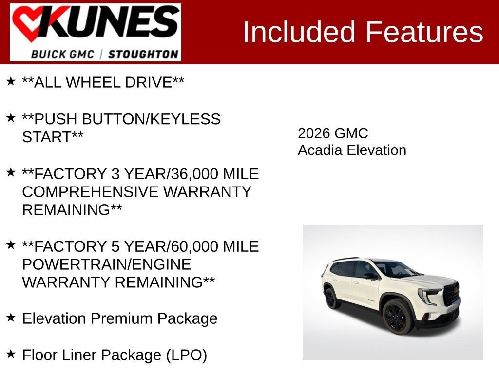 2026 GMC Acadia Elevation 2.5L DOHC **ADAPTIVE CRUISE**, **ADVANCED SAFETY Tech**, **REMOTE START**, **BACKUP CAMERA**, **SIRIUSXM RADIO**, **BLUETOOTH**, **HEATED SEATS**, **LEATHER SEATS**, **POWER REAR LIFTGATE**, **ALL WHEEL DRIVE**, **PUSH BUTTON/KEYLESS START**, **FACTORY 3 YEAR/36,000 MILE COMPREHENSIVE WARRANTY REMAINING**, **FACTORY 5 YEAR/60,000 MILE POWERTRAIN/ENGINE WARRANTY REMAINING**, AWD, After Dark Cloth, 1st & 2nd Row All-Weather Floor Liner (LPO), 3-Channel Programmable Universal Home Remote, 3rd Row All-Weather Floor Liner (LPO), 6-Way Power Front Passenger Seat Adjuster, 7-Passenger Seating (2-2-3 Seating Configuration), 8 Diagonal Head-Up Display, Black Edition, CoreTec Seat Trim, Elevation Premium Package, Floor Liner Package (LPO), Front & Rear Black GMC Emblems (LPO), Front Passenger Power Lumbar Seat Adjuster, Gloss Black Roof Rails, Heated Rear Outboard Seating Positions, Heated Wiper Park, High Gloss Black Door Upper Moldings, Integrated Cargo Liner (LPO), Laminated Acoustic Glass, Luxury Package, Wheels: 22 x 8.5 Gloss Black Aluminum.Also included with every new vehicle we sell: LIFETIME NO FEAR WARRANTY, FIRST OIL CHANGE, and AT HOME COURTESY DELIVERY! Call us for full details! We pride ourselves on honesty and integrity, but please note that mistakes or misprints due to human error are possible. Find out why our dealerships have won DealerRater.com DEALER OF THE YEAR a whopping 10 TIMES! Call, email, or live chat with one of our friendly sales professionals now to schedule your test drive! Prices shown do not include tax, title, registration and $499 service fees.