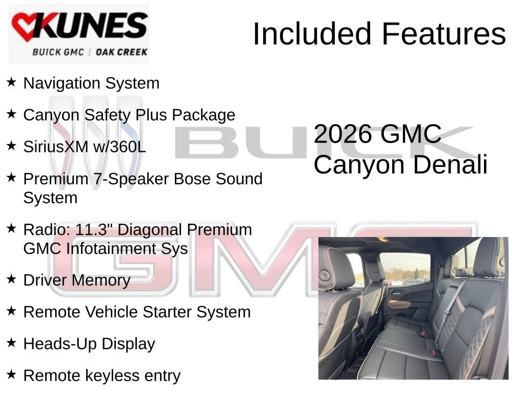 Onyx Black 2026 GMC Canyon Denali 4WD 8-Speed Automatic 2.7L I4 Turbocharged DOHC 16V LEV3-SULEV30 310hp 4WD, 2 1st Row USB Charge/Data Ports, 5 Rectangular Chrome Assist Steps, 6-Way Power Passenger Seat Adjuster, Canyon Safety Plus Package, Driver Memory, Heads-Up Display, Heated Steering Wheel, Navigation System, Premium 7-Speaker Bose Sound System, Rear Cross Traffic Braking, Remote keyless entry, Remote Vehicle Starter System, Ultrasonic Rear Park Assist, Wheels: 20 x 9 Diamond Cut Dark Gray Aluminum, Wireless Apple CarPlay/Wireless Android Auto, Wireless Phone Charging.