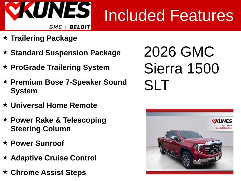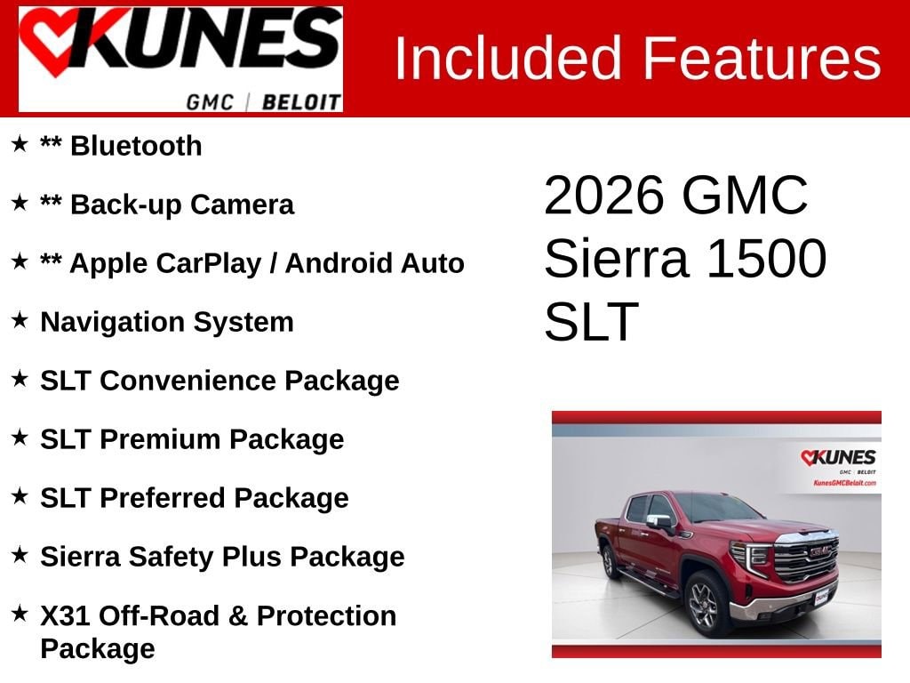 Gnt/Hve 2026 GMC Sierra 1500 SLT 4WD 10-Speed Automatic V8 ** Bluetooth, ** Back-up Camera, ** Apple CarPlay / Android Auto, 10-Speed Automatic, 4WD, Dark Walnut/Slate Leather, 2 Charge/Data USB Ports Inside Centre Console, Adaptive Cruise Control, All-Weather Floor Liner (LPO), Chrome Assist Steps, Electronic Precision Shift, Floor-Mounted Centre Console, Front Bucket Seats, HD Surround Vision, Heated 2nd Row Outboard Seats, Hitch Guidance, Hitch View, In-Vehicle Trailering System App, Navigation System, Power Rake & Telescoping Steering Column, Power Sliding Rear Window w/Rear Defogger, Power Sunroof, Premium Bose 7-Speaker Sound System, ProGrade Trailering System, Rear Cross Traffic Braking, Rear Pedestrian Alert, Safety Alert Seat, Sierra Safety Plus Package, SLT Convenience Package, SLT Preferred Package, SLT Premium Package, Standard Suspension Package, Trailer Camera Provisions, Trailer Side Blind Zone Alert, Trailering Package, Ultrasonic Front & Rear Park Assist, Universal Home Remote, Ventilated Driver & Front Passenger Seats, Wireless Charging, X31 Off-Road & Protection Package.