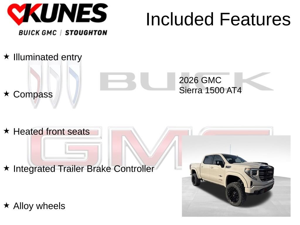 2026 GMC Sierra 1500 AT4 SHERROD DEADWOOD EDITION EcoTec3 6.2L V8 10-Speed Automatic, 4WD, Jet Black w/Kalahari Accents w/Perforated Front Leather Seat Trim, ABS brakes, Alloy wheels, Compass, Electronic Stability Control, Front dual zone A/C, Heated door mirrors, Heated front seats, Illuminated entry, Integrated Trailer Brake Controller, Low tire pressure warning, Remote keyless entry, Remote Vehicle Starter System, Traction control, Trailering Package.Also included with every new vehicle we sell: LIFETIME NO FEAR WARRANTY, FIRST OIL CHANGE, and AT HOME COURTESY DELIVERY! Call us for full details! We pride ourselves on honesty and integrity, but please note that mistakes or misprints due to human error are possible. Find out why our dealerships have won DealerRater.com DEALER OF THE YEAR a whopping 10 TIMES! Call, email, or live chat with one of our friendly sales professionals now to schedule your test drive! Prices shown do not include tax, title, registration and $599 service fees. The Madness Month Trade In Offer is available to anyone that trades in a vehicle 2020 or newer with less than 65k miles. Price includes: $1500 - Buick GMC Bonus Cash. Exp. 04/30/2026 $1750 - Buick & GMC Consumer Cash Program. Exp. 04/30/2026 Price includes $23,240 in dealer added accessories.