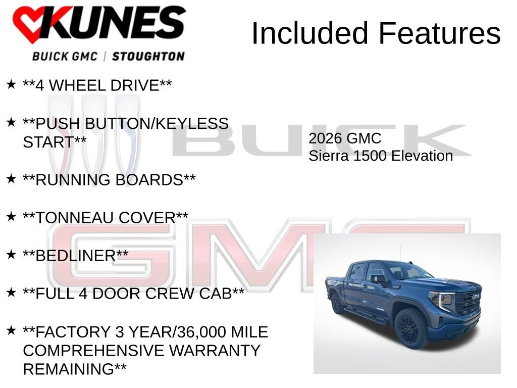 2026 GMC Sierra 1500 Elevation EcoTec3 5.3L V8 **ADVANCED SAFETY Tech**, **REMOTE START**, **BACKUP CAMERA**, **SIRIUSXM RADIO**, **REAR PARK ASSIST**, **BLUETOOTH**, **HEATED SEATS**, **LEATHER SEATS**, **POWER REAR LIFTGATE**, **4 WHEEL DRIVE**, **PUSH BUTTON/KEYLESS START**, **RUNNING BOARDS**, **TONNEAU COVER**, **BEDLINER**, **FULL 4 DOOR CREW CAB**, **FACTORY 3 YEAR/36,000 MILE COMPREHENSIVE WARRANTY REMAINING**, **FACTORY 5 YEAR/60,000 MILE POWERTRAIN/ENGINE WARRANTY REMAINING**, X31 PACKAGE, 10-Speed Automatic, 4WD, Jet Black w/Leather-Appointed Seat Trim, 120-Volt Bed Mounted Power Outlet, 120-Volt Interior Power Outlet, 2 Charge/Data USB Ports, 2 Type-C Charge-Only Rear USB Ports, 6-Speaker Audio System Feature, 6 Rectangular Black Tubular Assist Steps (LPO), Adaptive Cruise Control, All-Weather Floor Liner (LPO), Auto-Locking Rear Differential, Black GMC Emblems (LPO), Black Sierra Nameplates (LPO), Body Color Header w/Gloss Black Mesh Grille Bars, Cloth Rear Seat w/Storage Package, Color-Keyed Carpeting Floor Covering, Deep-Tinted Glass, Dual Exhaust System, Electric Rear-Window Defogger, Elevation Black Package (LPO), Elevation Premium Package, Front Frame-Mounted Black Recovery Hooks, Front Rubberized-Vinyl Floor Mats, HD Rear Vision Camera, HD Surround Vision, Heavy-Duty Air Filter, High Capacity Suspension Package, High Gloss Black Mirror Caps, Hill Descent Control, Hitch Guidance, Hitch View, In-Vehicle Trailering System App, Integrated Trailer Brake Controller, Keyless Open & Start, Leather-Appointed Seat Trim, LED Cargo Area Lighting, Manual Tilt-Wheel & Telescoping Steering Column, Off-Road Suspension, OnStar Services Capable, Perimeter Lighting, Power Door Locks, Power Front Windows w/Driver Express Up/Down, Power Front Windows w/Passenger Express Down, Power Rear Windows w/Express Down, Power Sliding Rear Window w/Rear Defogger, Preferred Equipment Group 3SB, Preferred Package, Premium Bose 7-Speaker Sound System, Push Button Start, Rear Cross Traffic Braking, Rear Pedestrian Detection, Rear Rubberized-Vinyl Floor Mats, Rear Wheelhouse Liners, Remote Vehicle Starter System, Sierra Safety Plus Package, SiriusXM w/360L Trial Subscription, Spray-On Pickup Bedliner w/GMC Logo, Steering Wheel Audio Controls, Theft Deterrent System (Unauthorized Entry), Trailer Camera Provisions, Trailer Side Blind Zone Alert, Trailering Package, Ultrasonic Front & Rear Park Assist, Universal Home Remote, Up-Level Rear Seat w/Storage Package, Wi-Fi Hotspot Capable, X31 Hard Badge, X31 Off-Road Package.