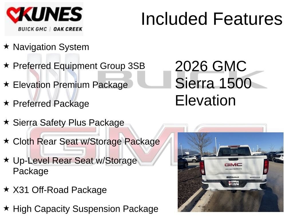Summit White 2026 GMC Sierra 1500 Elevation 4WD 10-Speed Automatic EcoTec3 5.3L V8 10-Speed Automatic, 4WD, Black Leather, 120-Volt Bed Mounted Power Outlet, 120-Volt Interior Power Outlet, 2 Charge/Data USB Ports, 2 Type-C Charge-Only Rear USB Ports, 6-Speaker Audio System Feature, Adaptive Cruise Control, Auto-Locking Rear Differential, Color-Keyed Carpeting Floor Covering, Deep-Tinted Glass, Dual Exhaust System, Electric Rear-Window Defogger, Elevation Premium Package, Front Frame-Mounted Black Recovery Hooks, Front Rubberized-Vinyl Floor Mats, HD Rear Vision Camera, HD Surround Vision, Heavy-Duty Air Filter, High Capacity Suspension Package, High Gloss Black Mirror Caps, Hill Descent Control, Hitch Guidance, Hitch View, Integrated Trailer Brake Controller, Leather-Appointed Seat Trim, LED Cargo Area Lighting, Navigation System, Off-Road Suspension, OnStar Services Capable, Perimeter Lighting, Power Door Locks, Preferred Equipment Group 3SB, Preferred Package, Premium Bose 7-Speaker Sound System, Push Button Start, Rear Cross Traffic Braking, Rear Pedestrian Detection, Rear Rubberized-Vinyl Floor Mats, Rear Wheelhouse Liners, Remote Vehicle Starter System, Sierra Safety Plus Package, Steering Wheel Audio Controls, Trailer Camera Provisions, Trailer Side Blind Zone Alert, Trailering Package, Universal Home Remote, Wi-Fi Hotspot Capable, X31 Hard Badge, X31 Off-Road Package.