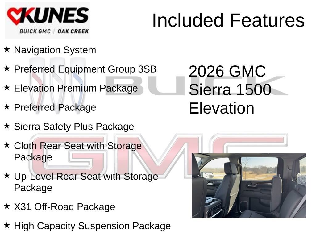 Sterling Metallic 2026 GMC Sierra 1500 Elevation 4WD 10-Speed Automatic EcoTec3 5.3L V8 10-Speed Automatic, 4WD, Black Leather, 10-Way Power Driver Seat Adjuster with Lumbar, 120-Volt Bed Mounted Power Outlet, 120-Volt Interior Power Outlet, 2 Charge/Data USB Ports, 2 Type-C Charge-Only Rear USB Ports, 4-Way Manual Passenger Seat Adjuster, 6-Speaker Audio System Feature, 6 Rectangular Black Tubular Assist Steps, Adaptive Cruise Control, All-Weather Floor Liner, Auto-Locking Rear Differential, Body Color Header with Gloss Black Mesh Grille Bars, Cloth Rear Seat with Storage Package, Color-Keyed Carpeting Floor Covering, Deep-Tinted Glass, Dual Exhaust System, Electric Rear-Window Defogger, Elevation Premium Package, Front 40/20/40 Split-Bench Seat, Front Frame-Mounted Black Recovery Hooks, Front Rubberized-Vinyl Floor Mats, HD Rear Vision Camera, HD Surround Vision, Heated Driver and Front Outboard Passenger Seating, Heavy-Duty Air Filter, High Capacity Suspension Package, High Gloss Black Mirror Caps, Hill Descent Control, Hitch Guidance, Hitch View, in-Vehicle Trailering System App, Integrated Trailer Brake Controller, Keyless Open and Start, Leather-Appointed Seat Trim, LED Cargo Area Lighting, Manual Tilt-Wheel and Telescoping Steering Column, Navigation System, Off-Road Suspension, OnStar Services Capable, Perimeter Lighting, Power Door Locks, Power Front Windows with Driver Express Up/Down, Power Front Windows with Passenger Express Down, Power Rear Windows with Express Down, Power Sliding Rear Window with Rear Defogger, Power Sunroof, Preferred Equipment Group 3SB, Preferred Package, Premium Bose 7-Speaker Sound System, Push Button Start, Rear Cross Traffic Braking, Rear Pedestrian Detection, Rear Rubberized-Vinyl Floor Mats, Rear Wheelhouse Liners, Remote Vehicle Starter System, Sierra Safety Plus Package, SiriusXM with 360L Trial Subscription, Spray-on Pickup Bedliner with GMC Logo, Steering Wheel Audio Controls, Theft Deterrent System (unauthorized Entry), Trailer Camera Provisions, Trailer Side Blind Zone Alert, Trailering Package, Ultrasonic Front and Rear Park Assist, Universal Home Remote, Up-Level Rear Seat with Storage Package, Wi-Fi Hotspot Capable, X31 Hard Badge, X31 Off-Road Package.Also included with every new vehicle we sell: LIFETIME NO FEAR WARRANTY, FIRST OIL CHANGE, and AT HOME COURTESY DELIVERY! Call us for full details! We pride ourselves on honesty and integrity, but please note that mistakes or misprints due to human error are possible. Find out why our dealerships have won DealerRater.com DEALER OF THE YEAR a whopping 10 TIMES! Call, email, or live chat with one of our friendly sales professionals now to schedule your test drive! Prices shown do not include tax, title, registration and $599 service fees. Price includes: $1750 - Buick & GMC Consumer Cash Program. Exp. 04/30/2026 $2500 - Buick GMC Bonus Cash. Exp. 04/30/2026