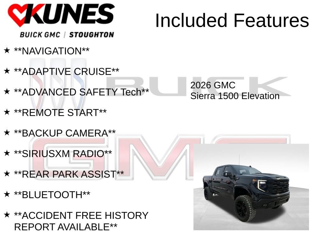 2026 GMC Sierra 1500 Elevation EcoTec3 5.3L V8 **NAVIGATION**, **ADAPTIVE CRUISE**, **ADVANCED SAFETY Tech**, **REMOTE START**, **BACKUP CAMERA**, **SIRIUSXM RADIO**, **REAR PARK ASSIST**, **BLUETOOTH**, **ACCIDENT FREE HISTORY REPORT AVAILABLE**, **FACTORY REMAINING WARRANTY**, **HEATED SEATS**, **LEATHER SEATS**, **POWER REAR LIFTGATE**, **4 WHEEL DRIVE**, **PUSH BUTTON/KEYLESS START**, **RUNNING BOARDS**, **BEDLINER**, **FULL 4 DOOR CREW CAB**, **FACTORY 3 YEAR/36,000 MILE COMPREHENSIVE WARRANTY REMAINING**, **FACTORY 5 YEAR/60,000 MILE POWERTRAIN/ENGINE WARRANTY REMAINING**, 10-Speed Automatic, 4WD, Jet Black w/Leather-Appointed Seat Trim, Adaptive Cruise Control, Dual Exhaust System, Elevation Premium Package, HD Surround Vision, Heavy-Duty Air Filter, High Capacity Suspension Package, High Gloss Black Mirror Caps, Hill Descent Control, Hitch Guidance, Hitch View, Leather-Appointed Seat Trim, Off-Road Suspension, Perimeter Lighting, Preferred Package, Premium Bose 7-Speaker Sound System, Rear Cross Traffic Braking, Rear Pedestrian Detection, Rear Wheelhouse Liners, Sierra Safety Plus Package, Trailer Camera Provisions, Trailer Side Blind Zone Alert, Trailering Package, Universal Home Remote, X31 Hard Badge, X31 Off-Road Package.