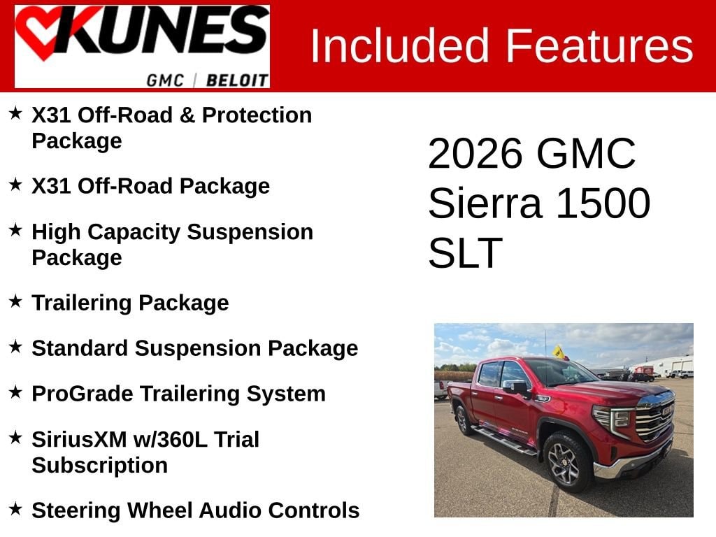 Volcanic Red Tintcoat 2026 GMC Sierra 1500 SLT 4WD 10-Speed Automatic EcoTec3 6.2L V8 ** Bluetooth, ** Back-up Camera, ** Apple CarPlay / Android Auto, 10-Speed Automatic, 4WD, Black Leather, 120-Volt Bed Mounted Power Outlet, 120-Volt Interior Power Outlet, 170 Amp Alternator, 2 Charge/Data USB Ports, 2 Charge/Data USB Ports Inside Center Console, 2 Type-C Charge-Only Rear USB Ports, 6-Speaker Audio System Feature, Adaptive Cruise Control, All-Weather Floor Liner (LPO), Auto-Locking Rear Differential, Auxiliary External Transmission Oil Cooler, Chrome Header & Chrome Grille Insert Bars, Chrome Wheel To Wheel Assist Steps, Color-Keyed Carpeting Floor Covering, Deep-Tinted Glass, Dual Exhaust System, Electric Rear-Window Defogger, Electronic Precision Shift, Floor-Mounted Center Console, Front Bucket Seats, Front Frame-Mounted Black Recovery Hooks, Front Rain-Sensing Wipers, HD Rear Vision Camera, HD Surround Vision, Heated 2nd Row Outboard Seats, Heavy-Duty Air Filter, High Capacity Suspension Package, Hill Descent Control, Hitch Guidance, Hitch View, In-Vehicle Trailering System App, Integrated Trailer Brake Controller, Keyless Open & Start, LED Cargo Area Lighting, Manual Tilt-Wheel & Telescoping Steering Column, Navigation System, Off-Road Suspension, OnStar Services Capable, Perimeter Lighting, Power Door Locks, Power Front Passenger Windows w/Express Up/Down, Power Front Windows w/Driver Express Up/Down, Power Rake & Telescoping Steering Column, Power Rear Windows w/Express Down, Power Sliding Rear Window w/Rear Defogger, Preferred Equipment Group 4SA, Premium Bose 7-Speaker Sound System, ProGrade Trailering System, Push Button Start, Rear Cross Traffic Braking, Rear Pedestrian Detection, Rear Wheelhouse Liners, Remote Vehicle Starter System, Safety Alert Seat, Sierra Safety Plus Package, SiriusXM w/360L Trial Subscription, SLT Convenience Package, SLT Preferred Package, SLT Premium Plus Package, Spray-On Pickup Bedliner w/GMC Logo, Standard Suspension Package, Steering Wheel Audio Controls, Theft Deterrent System (Unauthorized Entry), Trailer Camera Provisions, Trailer Side Blind Zone Alert, Trailering Package, Ultrasonic Front & Rear Park Assist, Universal Home Remote, Ventilated Driver & Front Passenger Seats, Wheels: 20 Polished Aluminum w/RFX, Wi-Fi Hotspot Capable, Wireless Charging, X31 Hard Badge, X31 Off-Road & Protection Package, X31 Off-Road Package.