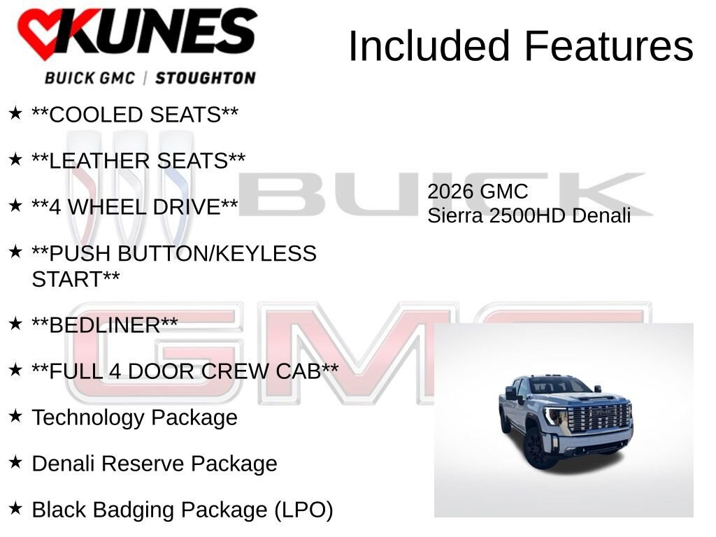 2026 GMC Sierra 2500HD Denali Duramax 6.6L V8 Turbodiesel **ADAPTIVE CRUISE**, **ADVANCED SAFETY Tech**, **SUNROOF**, **REMOTE START**, **BACKUP CAMERA**, **SIRIUSXM RADIO**, **REAR PARK ASSIST**, **BLUETOOTH**, **HEATED SEATS**, **COOLED SEATS**, **LEATHER SEATS**, **4 WHEEL DRIVE**, **PUSH BUTTON/KEYLESS START**, **BEDLINER**, **FULL 4 DOOR CREW CAB**, 10-Speed Automatic, 4WD, Jet Black w/Forge Perforated Leather-Appointed Front Seat Trim, 12-Way Power Driver Seat Adjuster w/Lumbar, 12-Way Power Passenger Seat Adjuster w/Lumbar, 220-Amp Alternator, Black Badging Package (LPO), Black GMC Emblems (LPO), Black Sierra Nameplates (LPO), Denali Reserve Package, Driver Memory, Inside Rearview Auto-Dimming Rear Camera Mirror, Multicolor 15 Diagonal Head-Up Display, Power driver seat, Power steering, Power Sunroof, Power windows, Remote keyless entry, Snow Plow Prep/Camper Package, Steering wheel mounted audio controls, Technology Package, Wheels: 22 Gloss Black Aluminum (LPO), Wheels: 22 Painted Black Transit Steel.Also included with every new vehicle we sell: LIFETIME NO FEAR WARRANTY, FIRST OIL CHANGE, and AT HOME COURTESY DELIVERY! Call us for full details! We pride ourselves on honesty and integrity, but please note that mistakes or misprints due to human error are possible. Find out why our dealerships have won DealerRater.com DEALER OF THE YEAR a whopping 10 TIMES! Call, email, or live chat with one of our friendly sales professionals now to schedule your test drive! Prices shown do not include tax, title, registration and $499 service fees. Price includes: $500 - Buick & GMC Consumer Cash Program. Exp. 12/01/2025