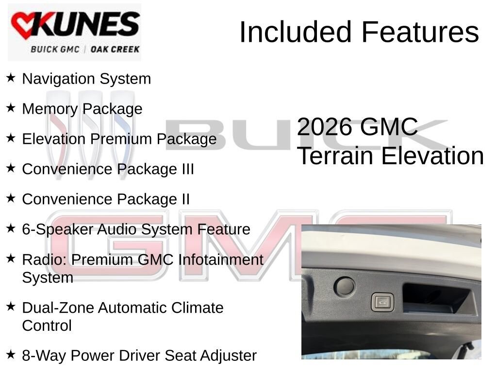 Summit White 2026 GMC Terrain Elevation AWD 8-Speed Automatic with Overdrive 1.5L DOHC AWD, 2-Way Power Driver Lumbar Seat Adjuster, 2-Way Power Front Passenger Lumbar Seat Adjuster, 3-Channel Programmable Universal Home Remote, 6-Speaker Audio System Feature, 8-Way Power Driver Seat Adjuster, 8-Way Power Passenger Seat Adjuster, Brushed Aluminum Roof Rails, Convenience Package II, Convenience Package III, CoreTec Seat Trim, Dual-Zone Automatic Climate Control, Elevation Premium Package, Front Intermittent RainSense Wipers, Heated Rear Outboard Seats, Heated steering wheel, Heated Wiper Park, Memory Package, Navigation System, Overhead Sunglass Storage, Radio: Premium GMC Infotainment System, Remote keyless entry, Ventilated Driver Seat, Ventilated Front Passenger Seat, Wheels: 17 Grazen Metallic Machined Aluminum, Wireless Apple CarPlay/Wireless Android Auto.