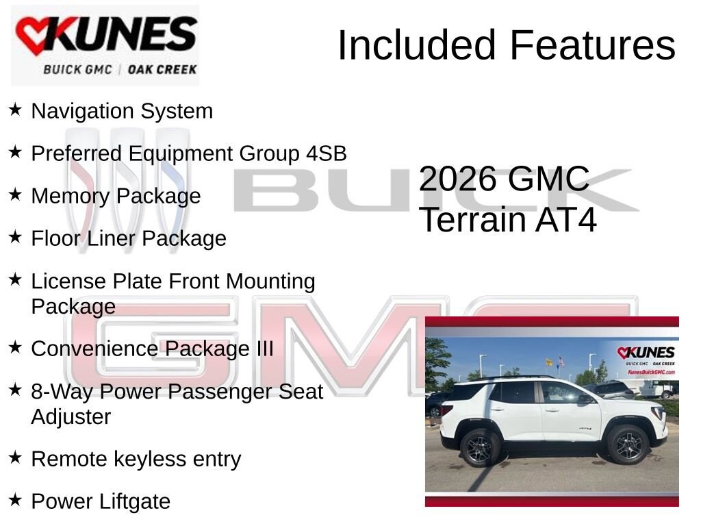 Summit White 2026 GMC Terrain AT4 AWD 8-Speed Automatic with Overdrive 1.5L DOHC AWD, 2-Way Power Front Passenger Lumbar Seat Adjuster, 8-Way Power Passenger Seat Adjuster, All-Weather Cargo Mat, Convenience Package III, Floor Liner Package, Front All-Weather Floor Liners, Heated Rear Outboard Seats, License Plate Front Mounting Package, Memory Package, Navigation System, Power Liftgate, Preferred Equipment Group 4SB, Remote keyless entry, Second Row All-Weather Mat, Ventilated Driver Seat, Ventilated Front Passenger Seat.