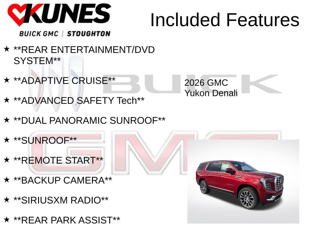 2026 GMC Yukon Denali 3.0L I6 **REAR ENTERTAINMENT/DVD SYSTEM**, **ADAPTIVE CRUISE**, **ADVANCED SAFETY Tech**, **DUAL PANORAMIC SUNROOF**, **SUNROOF**, **REMOTE START**, **BACKUP CAMERA**, **SIRIUSXM RADIO**, **REAR PARK ASSIST**, **BLUETOOTH**, **2ND ROW BUCKETS**, **3RD ROW SEATING**, **HEATED SEATS**, **COOLED SEATS**, **LEATHER SEATS**, **POWER REAR LIFTGATE**, **4 WHEEL DRIVE**, **7 PASSENGER SEATING**, **PUSH BUTTON/KEYLESS START**, **RUNNING BOARDS**, **LUXURY PACKAGE**, **FACTORY 3 YEAR/36,000 MILE COMPREHENSIVE WARRANTY REMAINING**, **FACTORY 5 YEAR/60,000 MILE POWERTRAIN/ENGINE WARRANTY REMAINING**, 4WD, Advanced Security Package, Advanced Technology Package, Air Ride Adaptive Suspension, Denali Reserve Package, Driver Attention Assist, Dual-Pane Panoramic Power Sunroof, Enhanced Trailering Technology Package, Extra Capacity Cooling System, Glass Breakage Sensor, Hill Descent Control, Hitch View, Integrated Trailer Brake Controller, Max Trailering Package, Power-Retractable Assist Steps, Rear Seat Media System, Smart Trailer Integration Indicator, Super Cruise, Theft-Deterrent Alarm System, Trailer Camera Provisions, Trailering Assist Guidelines, Vehicle Inclination Sensor, Vehicle Interior Movement Sensor.Also included with every new vehicle we sell: LIFETIME NO FEAR WARRANTY, FIRST OIL CHANGE, and AT HOME COURTESY DELIVERY! Call us for full details! We pride ourselves on honesty and integrity, but please note that mistakes or misprints due to human error are possible. Find out why our dealerships have won DealerRater.com DEALER OF THE YEAR a whopping 10 TIMES! Call, email, or live chat with one of our friendly sales professionals now to schedule your test drive! Prices shown do not include tax, title, registration and $499 service fees.