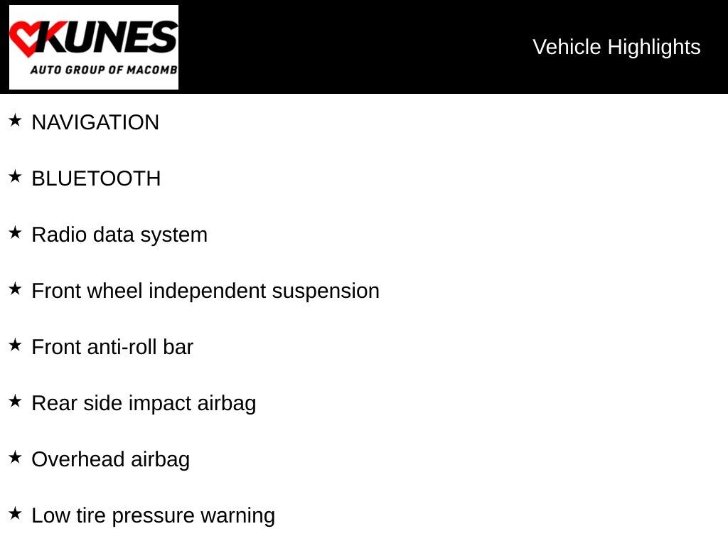 ⢠Rear head, front head, side, and knee airbags for occupant safety