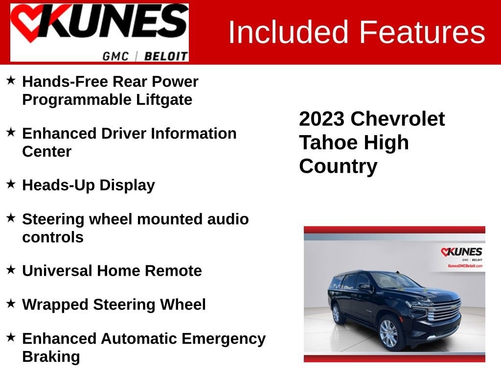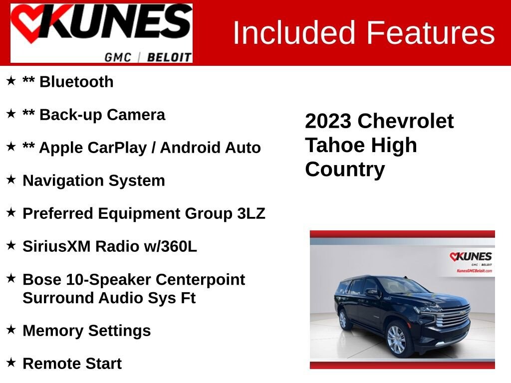 Recent Arrival! 4D Sport Utility 2023 Chevrolet Tahoe High Country Black 4WD 10-Speed Automatic with Overdrive EcoTec3 6.2L V8 CARFAX One-Owner. ** Bluetooth, ** Back-up Camera, ** Apple CarPlay / Android Auto, 4WD, Jet Black/Mocha Leather, 15 Diagonal Multi-Color Head-Up Display, 1st & 2nd Row Color-Keyed Carpeted Floor Mats, 2-Speed Active Electronic AutoTrac Transfer Case, 3rd Row 60/40 Power-Folding Split-Bench Seat, Bose 10-Speaker Centerpoint Surround Audio Sys Ft, Bright Front & Rear Door Sill Plates, Chrome Door Handles w/Body-Color Strip, Color-Keyed Carpeting Floor Covering, Driver & Front Outboard Passenger Airbags, Dual Exhaust System, Dual-Pane Power Panoramic Sunroof, Enhanced Automatic Emergency Braking, Enhanced Driver Information Center, Exterior Parking Camera Rear, Floor Console, Hands-Free Rear Power Programmable Liftgate, HD Surround Vision, Heads-Up Display, Heated 2nd Row Outboard Seats, Heated Steering Wheel, Hill Descent Control, Infotainment Display, Inside Rearview Auto-Dimming Rear Camera Mirror, Lane Change Alert w/Side Blind Zone Alert, LED Daytime Running Lamps, Memory Settings, Navigation System, Outside Heated Power-Adjustable Mirrors, Power Liftgate, Power Release 2nd Row Bucket Seats, Power Tilt & Telescopic Steering Column, Preferred Equipment Group 3LZ, Rear Camera Mirror Washer, Rear Cross Traffic Alert, Rear Pedestrian Alert, Remote Start, Safety Alert Seat, SiriusXM Radio w/360L, Steering wheel mounted audio controls, Universal Home Remote, Wireless Charging, Wrapped Steering Wheel.