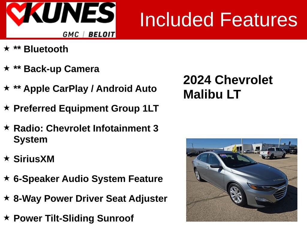 Recent Arrival! 4D Sedan 2024 Chevrolet Malibu LT 1LT 1LT Sterling Gray Metallic FWD CVT 1.5L DOHC CARFAX One-Owner. Clean CARFAX. ** Bluetooth, ** Back-up Camera, ** Apple CarPlay / Android Auto, Malibu LT 1LT, Sterling Gray Metallic, Black Cloth, 17 Aluminum Wheels, 6-Speaker Audio System Feature, 8-Way Power Driver Seat Adjuster, Auto High-beam Headlights, Compass, Exterior Parking Camera Rear, Front Bucket Seats, Heated Driver & Front Passenger Seats, Heated front seats, Illuminated entry, Outside temperature display, Power Tilt-Sliding Sunroof, Preferred Equipment Group 1LT, Radio: Chevrolet Infotainment 3 System, SiriusXM, Wireless Apple CarPlay/Android Auto.