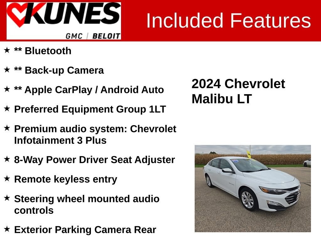 Recent Arrival! 4D Sedan 2024 Chevrolet Malibu LT 1LT 1LT Summit White FWD CVT 1.5L DOHC CARFAX One-Owner. Clean CARFAX. ** Bluetooth, ** Back-up Camera, ** Apple CarPlay / Android Auto, Black Cloth, 17 Aluminum Wheels, 8-Way Power Driver Seat Adjuster, Auto High-beam Headlights, Compass, Exterior Parking Camera Rear, Illuminated entry, Outside temperature display, Preferred Equipment Group 1LT, Premium audio system: Chevrolet Infotainment 3 Plus, Remote keyless entry, Security system, Steering wheel mounted audio controls.