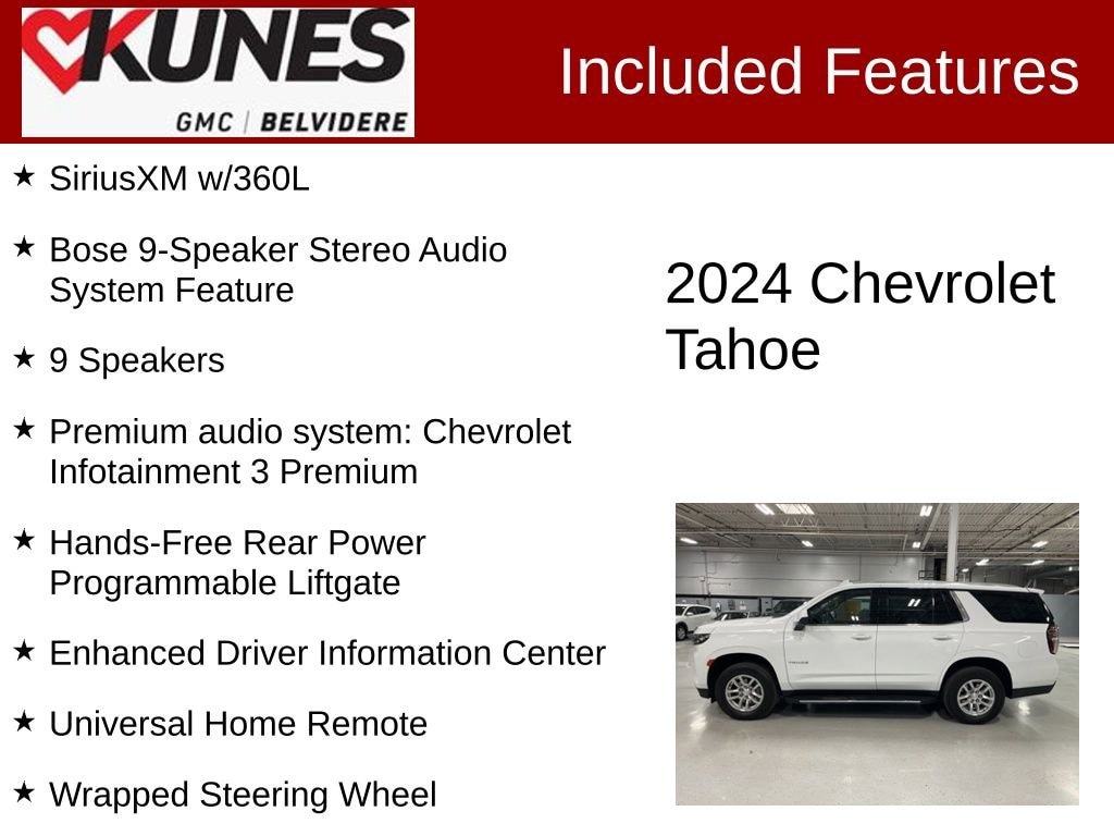 Recent Arrival! 2024 Chevrolet Tahoe LT LT 10-Way Power Driver & Passenger Seat Adjusters, 2nd Row Manual Bucket Seats, 9 Speakers, Apple CarPlay/Android Auto, Auto-dimming Rear-View mirror, Bose 9-Speaker Stereo Audio System Feature, Bright Front & Rear Door Sill Plates, Color-Keyed Carpeting Floor Covering, Compass, Driver & Front Outboard Passenger Airbags, Emergency communication system: OnStar and Chevrolet connected services capable, Enhanced Driver Information Center, Floor Console w/Storage Area, Four wheel independent suspension, Front Center Armrest, Front High-Back Reclining Bucket Seats, Front reading lights, Hands-Free Rear Power Programmable Liftgate, Heated Driver & Front Passenger Seats, Illuminated entry, Memory Settings for Driver, Outside temperature display, Overhead airbag, Panic alarm, Power Liftgate, Premium audio system: Chevrolet Infotainment 3 Premium, Rear anti-roll bar, Rear reading lights, Rear seat center armrest, SiriusXM w/360L, Speed-sensing steering, Split folding rear seat, Spoiler, Tachometer, Trip computer, Universal Home Remote, Voltmeter, Wireless Charging, Wrapped Steering Wheel. Summit White