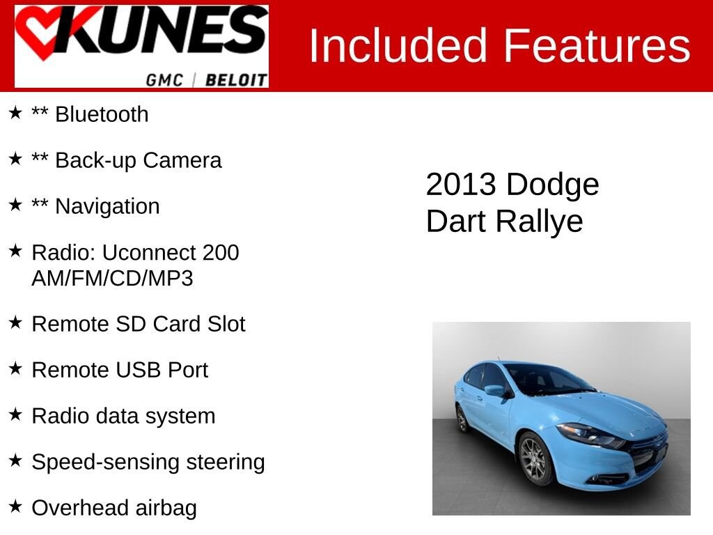 2013 Dodge Dart SXT/Rallye Laguna Blue FWD Tigershark 2.0L I4 DOHCRecent Arrival! Clean CARFAX. 6-speed automatic transmission 24T Rallye preferred package: aluminum wheels, fog lamps, cruise control, leather steering wheel, steering wheel audio controls 8.4-inch Uconnect touchscreen with backup camera, navigation, MP3/CD player, and auxiliary input Technology Group: navigation system, satellite radio, back-up camera, CD/MP3, auxiliary audio input LED racetrack taillamps Aluminum wheels Power mirrors Daytime running lights Bi-function halogen projector headlamps Cloth seating with bucket front seats Front and rear performance tires Touring suspension and rear stabilizer bar Cruise control Driver and passenger vanity mirrors Power windows and power door locks Keyless entry and remote trunk release Front and rear seat airbags, knee airbag, head and side airbags Brake assist, electronic stability control, and traction control Tire pressure monitoring system Hill start assist and emergency trunk release Leather-wrapped steering wheel with controls