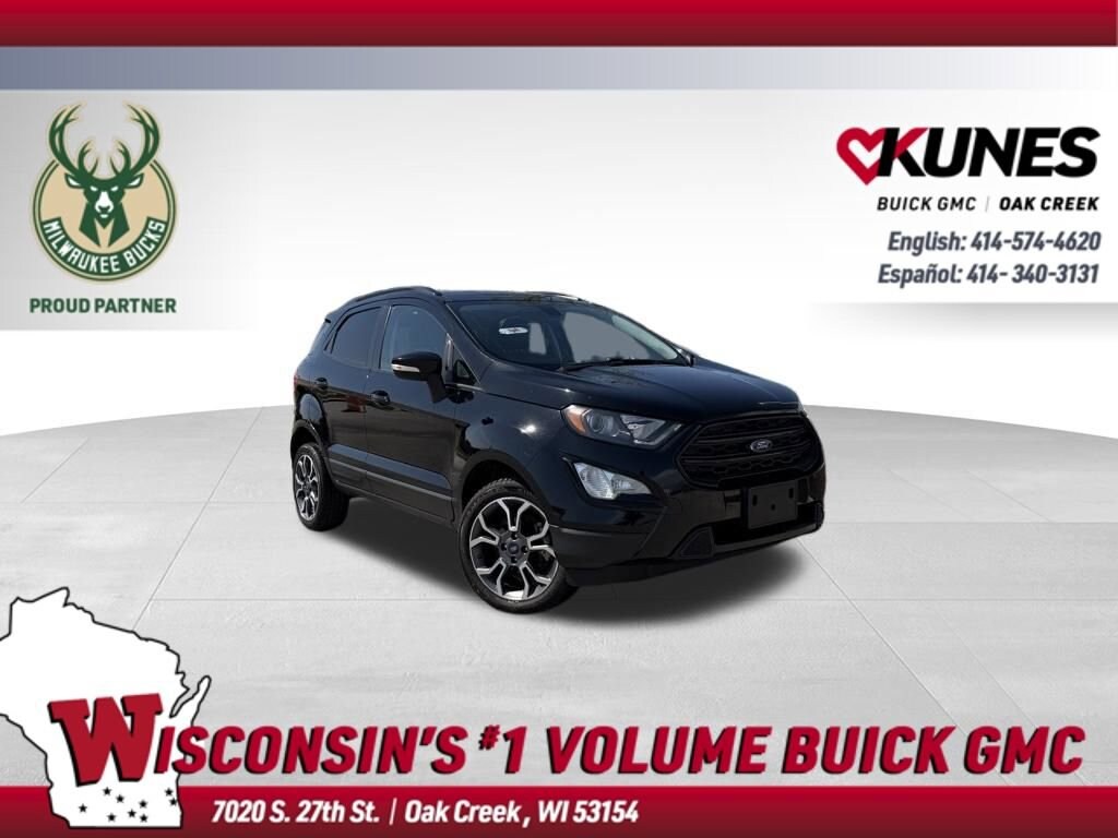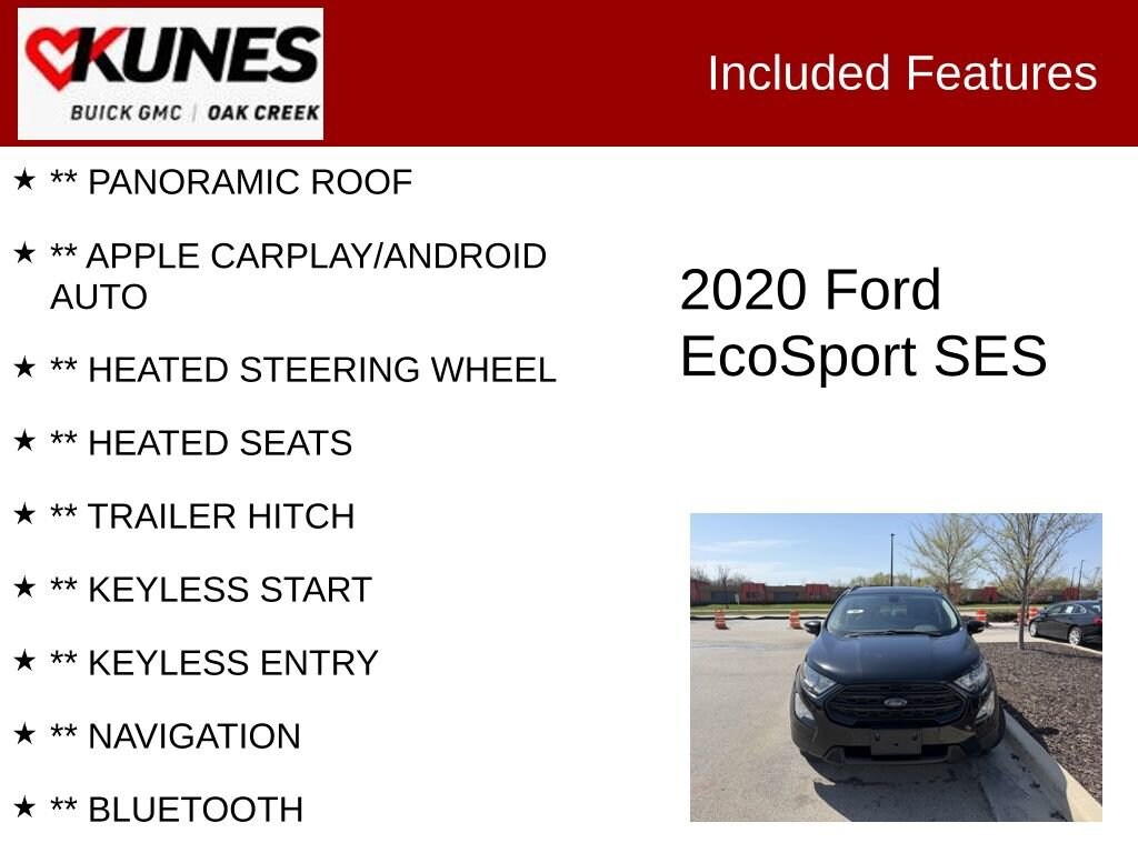 2020 Ford EcoSport SES Black 4WD 2.0L I4 Ti-VCT GDIRecent Arrival! Clean CARFAX. CARFAX One Owner. Equipment Group 200A package 17 premium painted aluminum wheels Roof rails with black crossbars Heated front seats Power moonroof Remote start system Rear parking sensors Voice-activated touchscreen navigation Intelligent access with push-button start Blind spot monitoring with rear cross-traffic alert SYNC 3 with Apple CarPlay and Android Auto SiriusXM radio with a 3-month trial Premium 7-speaker audio system Smart-charging USB ports Sport-tuned suspension Trailer tow prep wiring Automatic headlights with LED signature lighting Rearview camera Unique ebony black interior with ActiveX seating FordPass Connect with 4G LTE Wi-Fi hotspot