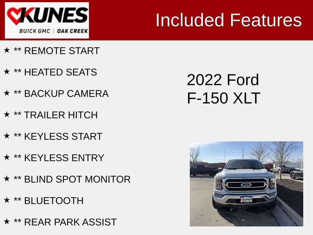 ** REMOTE START, ** HEATED SEATS, ** BACKUP CAMERA, ** TRAILER HITCH, ** KEYLESS START, ** KEYLESS ENTRY, ** BLIND SPOT MONITOR, ** BLUETOOTH, ** REAR PARK ASSIST, 4WD.Milwaukee's newest Buick GMC with the best available inventory in the midwest.2022 Ford F-150 XLT 2.7L V6 EcoBoost 10-Speed Automatic 4WDFind out why our dealerships have won DealerRater.com DEALER OF THE YEAR a whopping 10 TIMES! Call, email, or live chat with one of our friendly sales professionals now to schedule your test drive! Prices shown do not include tax, title, registration and $599 service fees.