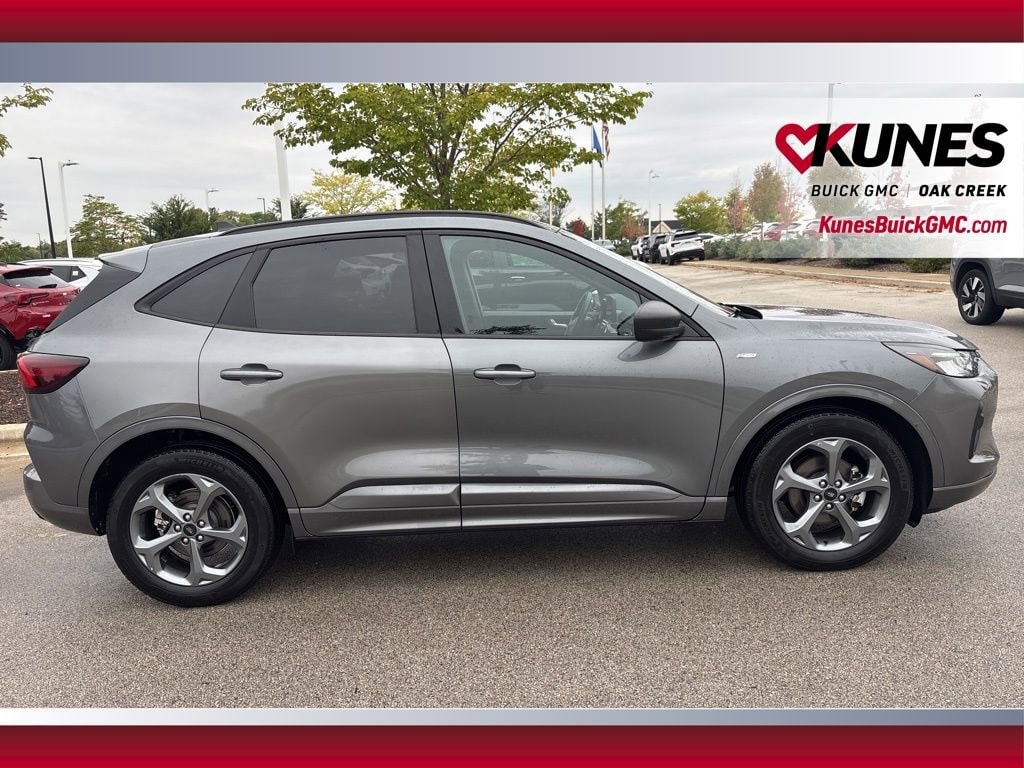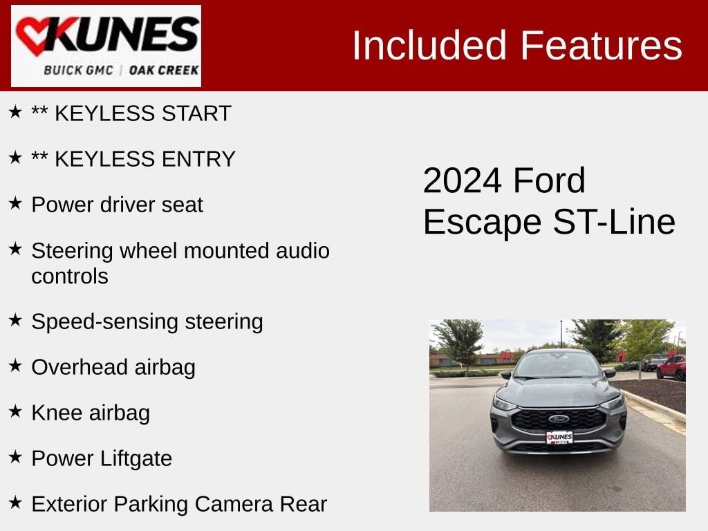 2024 Ford Escape ST-Line Gray Metallic FWD 1.5L EcoBoostRecent Arrival! CARFAX One Owner. Optional 18 rock metallic painted wheels All-season 225/60R18 tires FordPass Connect with remote start, lock/unlock, and vehicle finder Dual zone automatic climate control Intelligent access with push-button start Aluminum sport pedals Power driver seat Rear window privacy glass Rear seat cupholders and armrest SiriusXM radio USB A and C ports Auto start-stop feature Electronic parking brake Touchdown driver window Heated side mirrors Rear window wiper and washer Tire pressure monitoring system Rear parking sensors Cross-traffic alert Safety canopy with side curtain airbags AdvanceTrac with Roll Stability Control 8-way adjustable driver seat Flat-bottom sport steering wheel