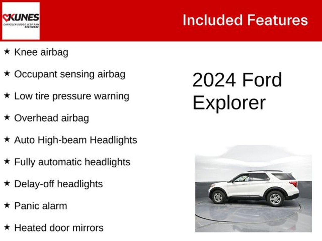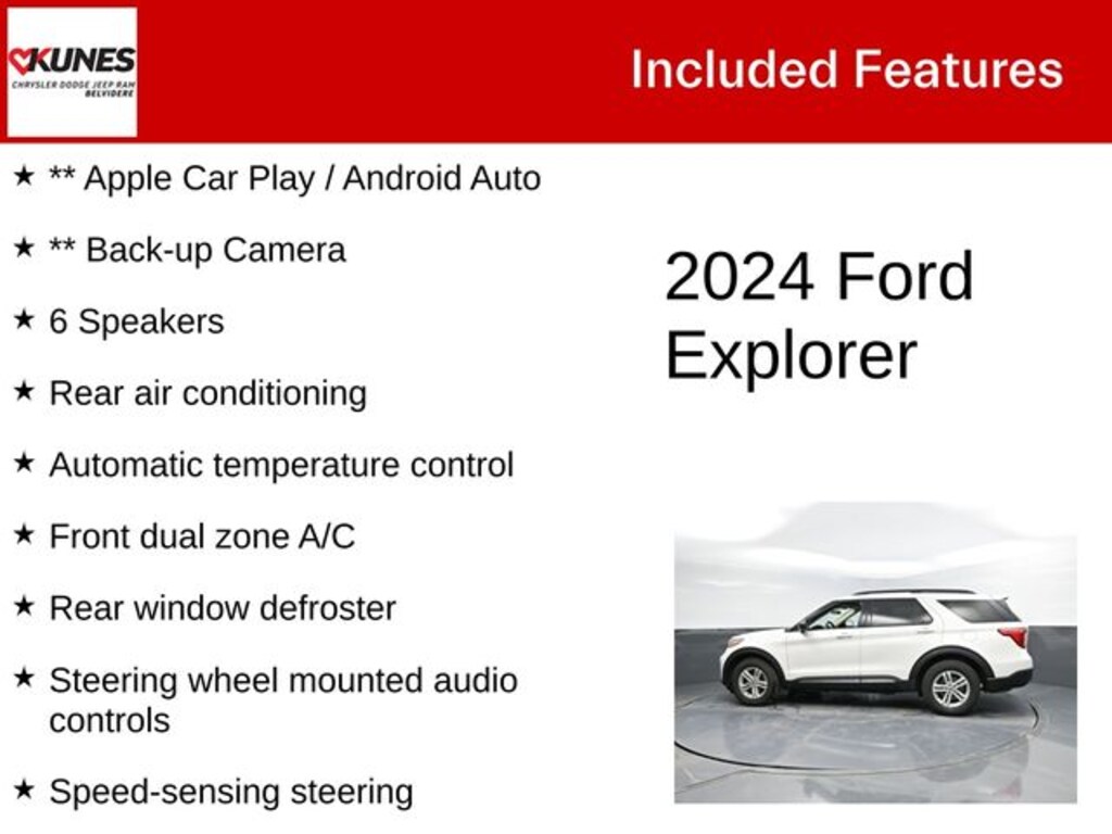 2024 Ford Explorer XLT 4WD ** Apple Car Play / Android Auto, ** Back-up Camera, 6 Speakers, Auto High-beam Headlights, Automatic temperature control, Compass, Delay-off headlights, Driver door bin, Driver vanity mirror, Front Center Armrest, Front dual zone A/C, Front reading lights, Fully automatic headlights, Heated door mirrors, Heated front seats, Heated Unique Cloth Captain's Chairs, Illuminated entry, Knee airbag, Leather steering wheel, Low tire pressure warning, Occupant sensing airbag, Outside temperature display, Overhead airbag, Overhead console, Panic alarm, Passenger door bin, Passenger vanity mirror, Rear air conditioning, Rear reading lights, Rear window defroster, Rear window wiper, Speed-sensing steering, Speed-Sensitive Wipers, Split folding rear seat, Spoiler, Steering wheel mounted audio controls, Tachometer, Telescoping steering wheel, Tilt steering wheel, Trip computer.