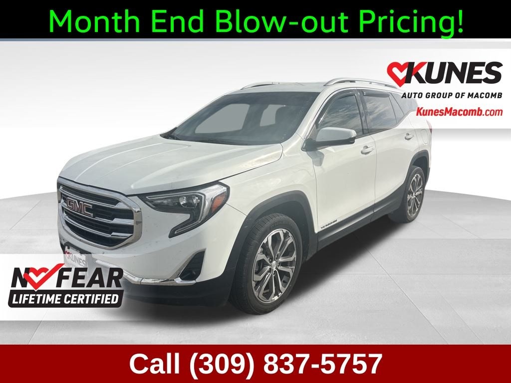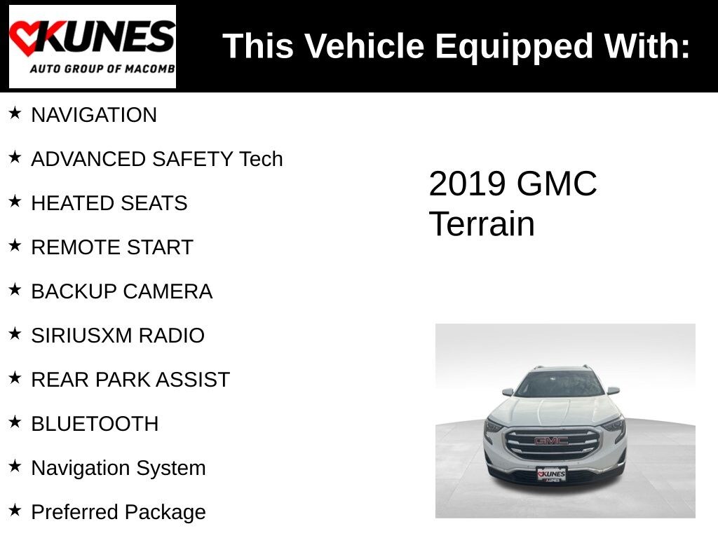 2019 GMC Terrain SLT NAVIGATION, ADVANCED SAFETY Tech, HEATED SEATS, REMOTE START, BACKUP CAMERA, SIRIUSXM RADIO, REAR PARK ASSIST, BLUETOOTH, AWD, 2 USB Data Ports, 2 USB Data Ports w/SD Card Reader, 4-Way Manual Front Passenger Seat, 6-Speaker Audio System Feature, 6-Way Power Front Passenger Seat, AM/FM radio: SiriusXM, Apple CarPlay/Android Auto, Automatic temperature control, Body-Color Door Handles w/Chrome Surround, Compass, Delay-off headlights, Front Bucket Seats, Front Center Armrest, Front dual zone A/C, Front Passenger 2-Way Power Lumbar, Front reading lights, Hands-Free Rear Power Programmable Liftgate, Heated Steering Wheel, Illuminated entry, Memory Package, Navigation System, Occupant sensing airbag, Outside temperature display, Overhead console, Panic alarm, Preferred Package, Radio data system, Radio: GMC Infotainment Audio System w/8" Display, Rear Park Assist, Rear seat center armrest, Rear window defroster, Rear window wiper, Roof Rack Cross Rails (LPO), Speed-sensing steering, Split folding rear seat, Spoiler, Telescoping steering wheel, Tilt steering wheel, Universal Home Remote, Variably intermittent wipers, Wheels: 18" x 7" Machined Aluminum w/Gray Accents. Summit White