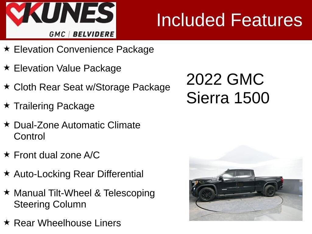 Recent Arrival! 2022 GMC Sierra 1500 Limited Elevation Elevation 10-Way Power Driver Seat Adjuster w/Lumbar, Apple CarPlay/Android Auto, Auto-Locking Rear Differential, Cloth Rear Seat w/Storage Package, Dual-Zone Automatic Climate Control, Elevation Convenience Package, Elevation Value Package, Front dual zone A/C, Heated Driver & Front Outboard Passenger Seating, Heated Steering Wheel, Hitch Guidance, Manual Tilt-Wheel & Telescoping Steering Column, Rear Wheelhouse Liners, Trailering Package, Wheels: 20 x 9 Black Gloss Painted Aluminum. BlackOpened with Kunes in June 2020 along with Kunes CDJR of Belvidere, Kunes Cadillac GMC of Belvidere allows us to have another location close to home for you to find your ideal Cadillac or GMC vehicle. Being so close to Rockford, IL means that we are at a convenient location for many Illinois as well as Wisconsin residents. Previously Kunes Country, Kunes Auto Group has stayed true to our values with our slogan of Faith, Family, and Giving Back. These four words embody what Kunes Auto Group is all about. We strive to build people's lives and we live up to that by employing over 2,000 people and donating 10% of our yearly net profits to charities in our communities. Our dedication to our employees, customers, and communities is shown through our countless Automotive Newsâ Best Dealerships to Work For awards that are given to 100 dealers nationwide every year. While we make every effort to ensure the data listed here is correct, there may be instances where some of the options or vehicle features may be listed incorrectly as we get data from multiple data sources. PLEASE MAKE SURE to confirm the details of this vehicle with the dealer to ensure its accuracy. Dealer cannot be held liable for data that is listed incorrectly. Prices shown do not include taxes, license, and title fees and a $377.63 documentary service fee.