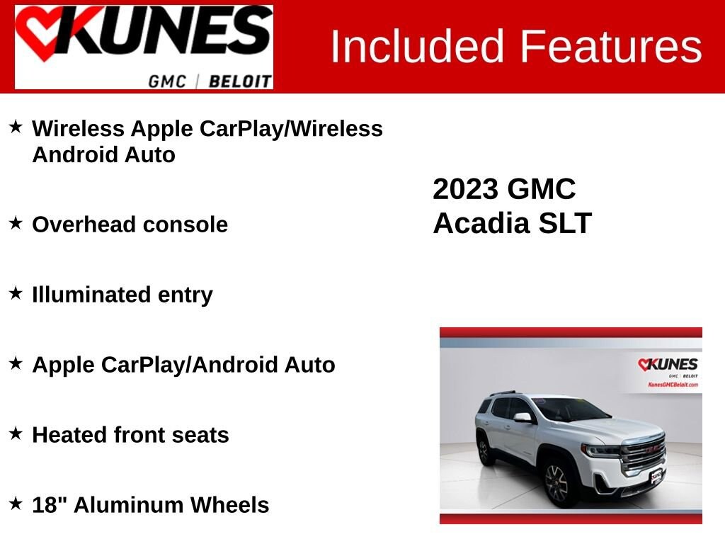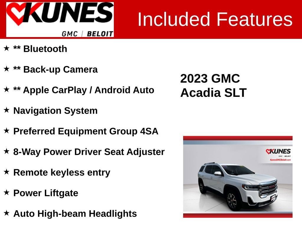 Recent Arrival! 4D Sport Utility 2023 GMC Acadia SLT Summit White AWD 9-Speed Automatic 2.0L Turbocharged CARFAX One-Owner. Clean CARFAX. ** Bluetooth, ** Back-up Camera, ** Apple CarPlay / Android Auto, AWD, Gray Leather, 18 Aluminum Wheels, 8-Way Power Driver Seat Adjuster, Apple CarPlay/Android Auto, Auto High-beam Headlights, Heated front seats, Illuminated entry, Navigation System, Overhead console, Power Liftgate, Preferred Equipment Group 4SA, Remote keyless entry, Wireless Apple CarPlay/Wireless Android Auto.