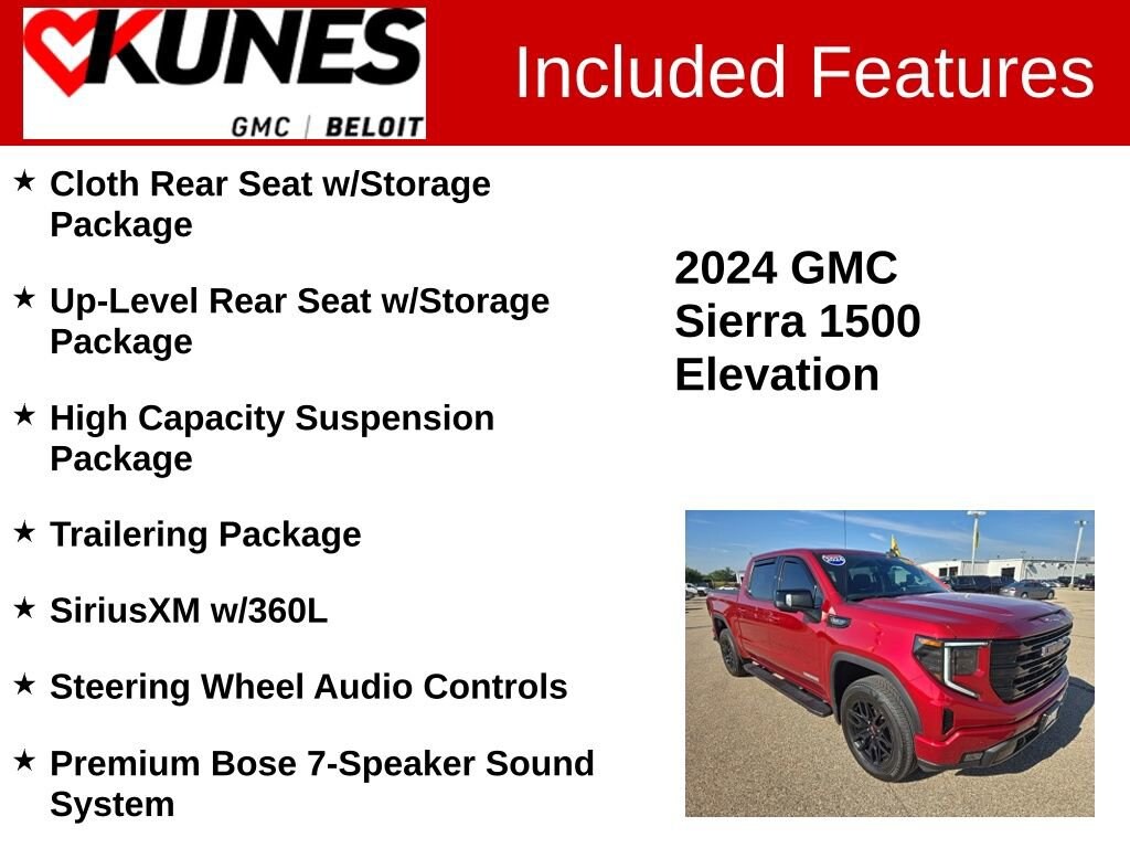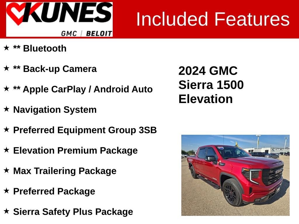 Recent Arrival! 4D Crew Cab 2024 GMC Sierra 1500 Elevation Volcanic Red Tintcoat 4WD 10-Speed Automatic EcoTec3 5.3L V8 CARFAX One-Owner. Clean CARFAX. ** Bluetooth, ** Back-up Camera, ** Apple CarPlay / Android Auto, 10-Speed Automatic, 4WD, Black Leather, 120-Volt Bed Mounted Power Outlet, 120-Volt Interior Power Outlet, 2 Charge/Data USB Ports, 2 Type-C Charge-Only Rear USB Ports, 6-Speaker Audio System Feature, Adaptive Cruise Control, All-Weather Floor Liner (LPO), Auto High-beam Headlights, Auto-Locking Rear Differential, Body Color Header w/Gloss Black Mesh Grille Bars, Cloth Rear Seat w/Storage Package, Color-Keyed Carpeting Floor Covering, Deep-Tinted Glass, Electric Rear-Window Defogger, Elevation Premium Package, Enhanced Cooling Radiator, Front Frame-Mounted Black Recovery Hooks, Front Rubberized-Vinyl Floor Mats, GMC Connected Access Capable, HD Rear Vision Camera, HD Surround Vision, Heated Driver & Front Outboard Passenger Seating, Heavier Duty Rear Springs, High Capacity Suspension Package, High Gloss Black Mirror Caps, Hitch Guidance, Hitch View, In-Vehicle Trailering System App, Increased RGAWR, Integrated Trailer Brake Controller, Keyless Open & Start, LED Cargo Area Lighting, Manual Tilt-Wheel & Telescoping Steering Column, Max Trailering Package, Navigation System, OnStar & GMC Connected Services Capable, Perimeter Lighting, Power Door Locks, Power Front Windows w/Driver Express Up/Down, Power Front Windows w/Passenger Express Down, Power Rear Windows w/Express Down, Power Sliding Rear Window w/Rear Defogger, Power Sunroof, Preferred Equipment Group 3SB, Preferred Package, Premium Bose 7-Speaker Sound System, Push Button Start, Rear Cross Traffic Braking, Rear Pedestrian Detection, Rear Rubberized-Vinyl Floor Mats, Rear Wheelhouse Liners, Remote Vehicle Starter System, Sierra Safety Plus Package, SiriusXM w/360L, Spray-On Pickup Bedliner w/GMC Logo, Steering Wheel Audio Controls, Theft Deterrent System (Unauthorized Entry), Trailer Camera Provisions, Trailer Side Blind Zone Alert, Trailering Package, Ultrasonic Front & Rear Park Assist, Universal Home Remote, Up-Level Rear Seat w/Storage Package, Wheels: 20 x 9 High Gloss Black Painted Aluminum, Wi-Fi Hotspot Capable.