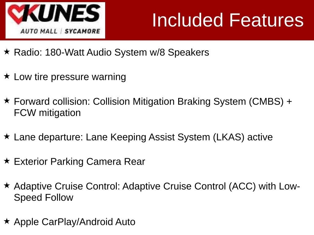 KUNES AUTO MALL OF SYCAMORE - Kunes Auto Group is dedicated to building peopleâs lives in the communities we serve. Weâre family-owned and operated. Gregg Kunes started with Kunes Ford Lincoln in Delavan, Wisconsin in 1996, and over the years we have grown to 40 automobile and RV dealerships throughout the Midwest. Our mission is to not only deliver exceptional customer service, but to serve our communities well in the form of projects, promotions, support, donations, and whatever else is needed. Find out why our dealerships have won DealerRater.com DEALER OF THE YEAR a whopping 10 TIMES! Call, email, or live chat with one of our friendly sales professionals now to schedule your test drive! Price excludes taxes, license and title fees and a $377.63 documentary service fee. While we make every effort to ensure the data listed here is correct, there may be instances where some of the options or vehicle features may be listed incorrectly as we get data from multiple data sources. PLEASE MAKE SURE to confirm the details of this vehicle with the dealer to ensure its accuracy. Dealer cannot be held liable for data that is listed incorrectly. Prices shown do not include taxes, license, and title fees and a $377.63 documentary service fee.
