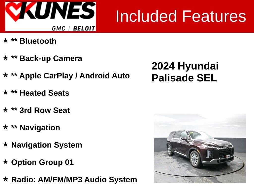 Recent Arrival! 4D Sport Utility 2024 Hyundai Palisade SEL 7 Passenger 7 Passenger Sierra Burgundy FWD 8-Speed Automatic with SHIFTRONIC V6 CARFAX One-Owner. ** Bluetooth, ** Back-up Camera, ** Apple CarPlay / Android Auto, ** Heated Seats, ** 3rd Row Seat, ** Navigation, Palisade SEL 7 Passenger, V6, Sierra Burgundy, 3rd row seats: split-bench, 6 Speakers, Auto-dimming door mirrors, Forward Collision Avoidance Assist, Four wheel independent suspension, Front anti-roll bar, Front Center Armrest, H-Tex Leatherette Seat Trim, Heated Front Bucket Seats, Low tire pressure warning, Navigation System, Occupant sensing airbag, Option Group 01, Outside temperature display, Overhead airbag, Overhead console, Passenger door bin, Passenger vanity mirror, Radio data system, Radio: AM/FM/MP3 Audio System, Rear anti-roll bar, Rear reading lights, Rear side impact airbag, Rear window wiper, Reclining 3rd row seat, Speed-sensing steering, Split folding rear seat, Tachometer, Telescoping steering wheel, Tilt steering wheel, Trip computer, Variably intermittent wipers, Wheels: 18 x 7.5J Painted Finish Alloy.