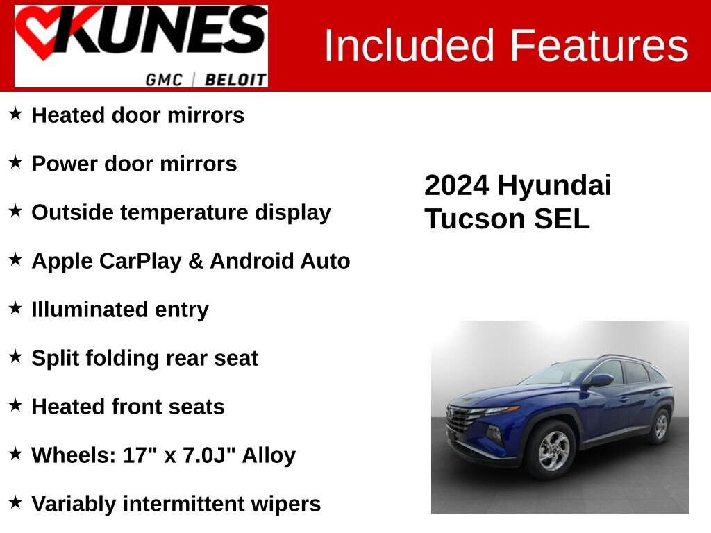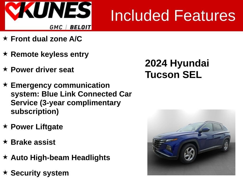 Recent Arrival! 4D Sport Utility 2024 Hyundai Tucson SEL Intense Blue FWD 8-Speed Automatic with SHIFTRONIC 2.5L I4 DGI DOHC 16V LEV3-SULEV30 187hp CARFAX One-Owner. Apple CarPlay & Android Auto, Auto High-beam Headlights, Brake assist, Emergency communication system: Blue Link Connected Car Service (3-year complimentary subscription), Front dual zone A/C, Heated door mirrors, Heated front seats, Illuminated entry, Outside temperature display, Power door mirrors, Power driver seat, Power Liftgate, Remote keyless entry, Security system, Split folding rear seat, Variably intermittent wipers, Wheels: 17 x 7.0J Alloy.