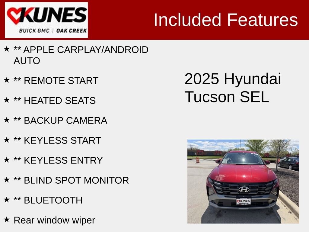 2025 Hyundai Tucson SEL Ultimate Red FWD 2.5L I4 DGI DOHC 16V LEV3-SULEV30 187hpRecent Arrival! CARFAX One Owner. Ultimate Red exterior color Heated power mirrors Blind spot monitor Lane departure warning and lane keeping assist Rear cross-traffic alert and forward collision mitigation Heated front seats with driver power adjustment and lumbar support Back-up camera Apple CarPlay and Android Auto compatible HD Radio, satellite radio, Bluetooth connection, streaming audio Multi-zone automatic climate control Smart key with push button start Aluminum wheels and tire pressure monitor Cruise control Rear parking sensors Privacy glass and automatic highbeams Power windows and door locks Multi-link rear suspension with gas-pressurized shocks Adjustable steering wheel, hands-free liftgate Rear spoiler and black body accents