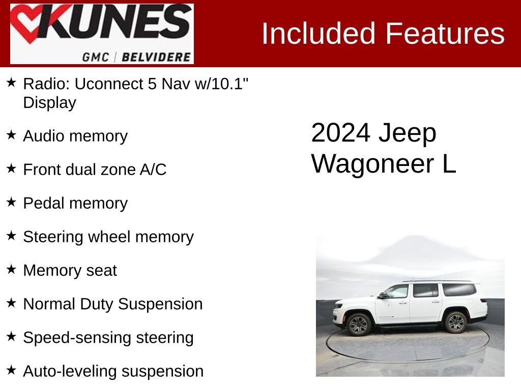 2024 Jeep Wagoneer L Series II Bright White Clearcoat 4WD 3.0L I6Recent Arrival! CARFAX One Owner. Flexible Seating Group with 3rd row seat and pass-through rear bench Running boards and tow hitch Blind spot monitoring Navigation system Rear parking aid and back-up camera Heated mirrors with integrated turn signals Premium sound system Keyless start and remote engine start Adaptive cruise control Driver adjustable lumbar with power driver seat Leather bucket seats with heated steering wheel Automatic full-time four-wheel drive Lane departure warning and lane keeping assist Front and rear air conditioning with multi-zone climate control WiFi hotspot and Bluetooth connection Power liftgate with hands-free trunk release Power windows and doors Alloy wheels, fog lamps, and privacy glass Rain-sensing and variable speed intermittent wipers Front collision warning and stability control