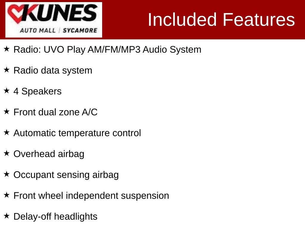 - Radio: UVO Play AM/FM/MP3 Audio System
