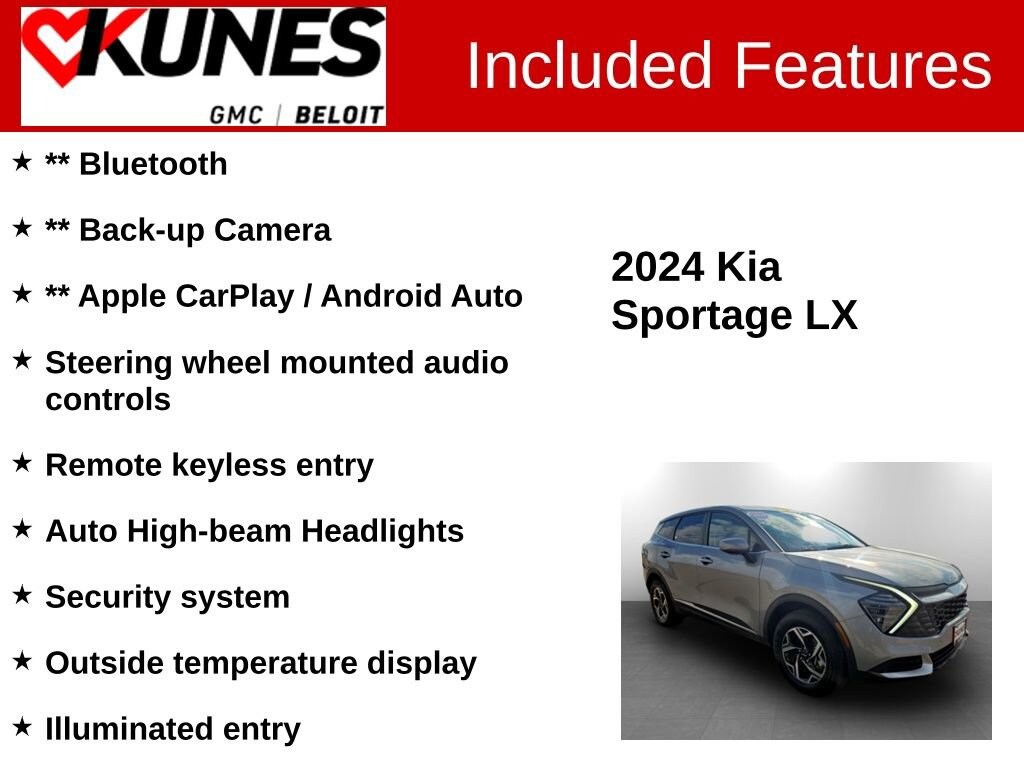 Recent Arrival! 4D Sport Utility 2024 Kia Sportage LX Steel Gray AWD 8-Speed Automatic I4 CARFAX One-Owner. Clean CARFAX. ** Bluetooth, ** Back-up Camera, ** Apple CarPlay / Android Auto, AWD, 17 Alloy Wheels, Auto High-beam Headlights, Heated Front Bucket Seats, Illuminated entry, Outside temperature display, Remote keyless entry, Security system, Steering wheel mounted audio controls, Telescoping steering wheel, Tilt steering wheel.