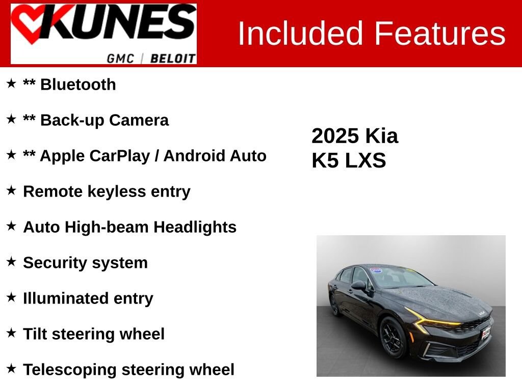 Recent Arrival! 4D Sedan 2025 Kia K5 LXS Aurora Black Pearl FWD 8-Speed Automatic I4 CARFAX One-Owner. Clean CARFAX. ** Bluetooth, ** Back-up Camera, ** Apple CarPlay / Android Auto, Auto High-beam Headlights, Illuminated entry, Outside temperature display, Remote keyless entry, Security system, Telescoping steering wheel, Tilt steering wheel, Wheels: 16 x 6.5J Gloss Black Alloy.Odometer is 3473 miles below market average! 26/37 City/Highway MPG