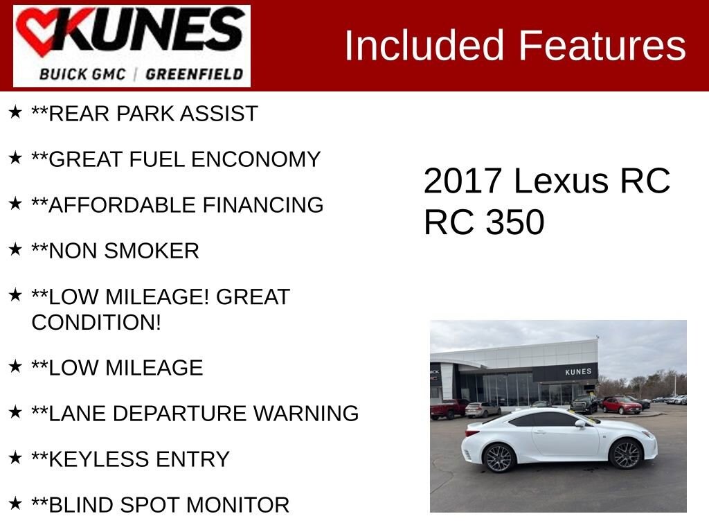 **LEATHER SEATS, **REMOTE START, **HEATED SEATS, **BACK UP CAMERA, **NAVIGATION, **BLUETOOTH, **KEYLESS START, **ADAPTIVE CRUISE, **ALL WHEEL DRIVE, **REAR PARK ASSIST, **GREAT FUEL ENCONOMY, **AFFORDABLE FINANCING, **NON SMOKER, **LOW MILEAGE! GREAT CONDITION!, **LOW MILEAGE, **LANE DEPARTURE WARNING, **KEYLESS ENTRY, **BLIND SPOT MONITOR. Certified. 19/26 City/Highway MPG Recent Arrival!Ultra White 2017 Lexus RC 350 2D Coupe AWD 6-Speed Automatic 3.5L V6 DOHC Dual VVT-i 24VCertification Program Details:** NO FEAR LIFETIME CERTIFIED PREOWNED **Over $2,895 of value at no cost!*LIFETIME WARRANTY!*3 Day Exchange Policy!*Complimentary powertrain warranty with ability to upgrade to fully comprehensive coverage and/or extend up to 125,000 miles!*125+ Point Inspection by our factory trained ASE Certified technicians and reconditioned to the highest standards.*Complimentary AutoCheck History Report*Complimentary AutoCheck Buyback Protection*Financing for Everyone - Guaranteed credit approval regardless of credit history!*Over 30 lenders who compete to get you the best financing terms*No payments for up to 90 days!*Weekly, Bi-Weekly, and Monthly Payment Options for all buyers!*First Free Oil Change!*Trade anytime policy - cars, trucks, boats, RVs, motorcycles - as long as we donât have to feed it, you can trade it!Find out why our dealerships have won DealerRater.com DEALER OF THE YEAR a whopping 10 TIMES! Call, email, or live chat with one of our friendly sales professionals now to schedule your test drive! Prices shown do not include tax, title, registration and $599 service fees.Awards:* 2017 KBB.com Best Resale Value Awards * 2017 KBB.com Brand Image Awards
