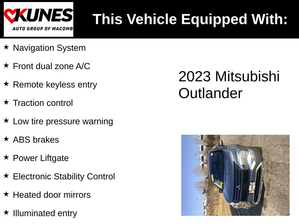 2023 Mitsubishi Outlander SE ABS brakes, Active Cruise Control, Alloy wheels, Electronic Stability Control, Front dual zone A/C, Heated door mirrors, Heated Front Bucket Seats, Heated front seats, Illuminated entry, Low tire pressure warning, Navigation System, Power Liftgate, Remote keyless entry, Traction control. Mercury Gray Metallic
