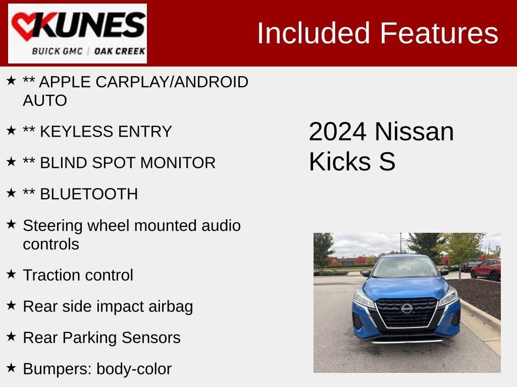 2024 Nissan Kicks S 1.6L 4-Cylinder DOHC 16V CVT with Xtronic FWD CARFAX One-Owner. Clean CARFAX. 31/36 City/Highway MPG