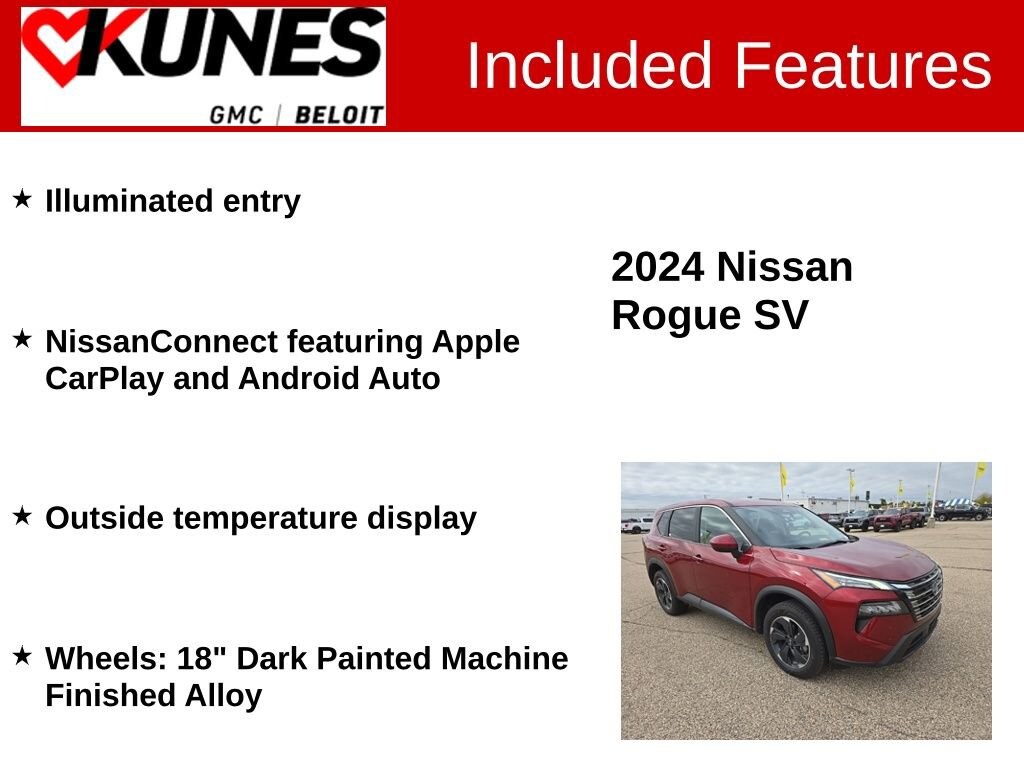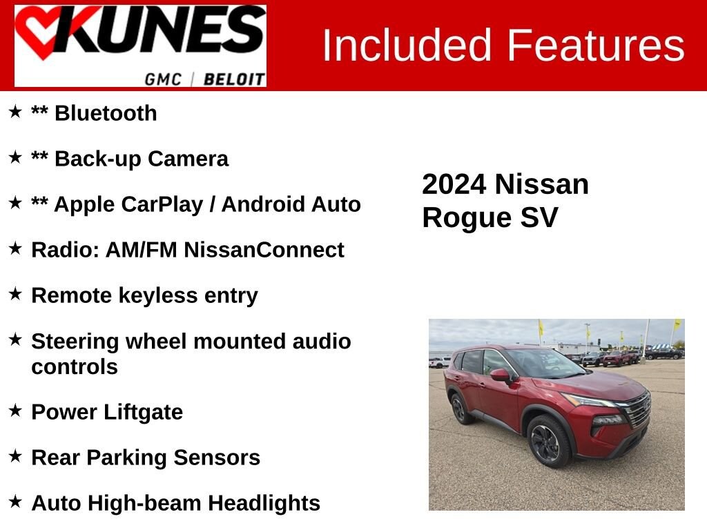 Recent Arrival! 4D Sport Utility 2024 Nissan Rogue SV Scarlet Ember Tintcoat AWD CVT with Xtronic 1.5L DOHC CARFAX One-Owner. ** Bluetooth, ** Back-up Camera, ** Apple CarPlay / Android Auto, AWD, Auto High-beam Headlights, Illuminated entry, NissanConnect featuring Apple CarPlay and Android Auto, Outside temperature display, Power Liftgate, Radio: AM/FM NissanConnect, Rear Parking Sensors, Remote keyless entry, Steering wheel mounted audio controls, Wheels: 18 Dark Painted Machine Finished Alloy.