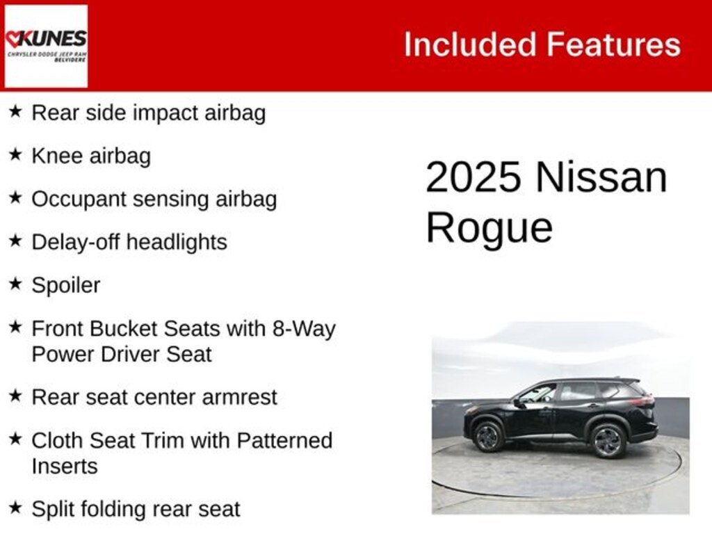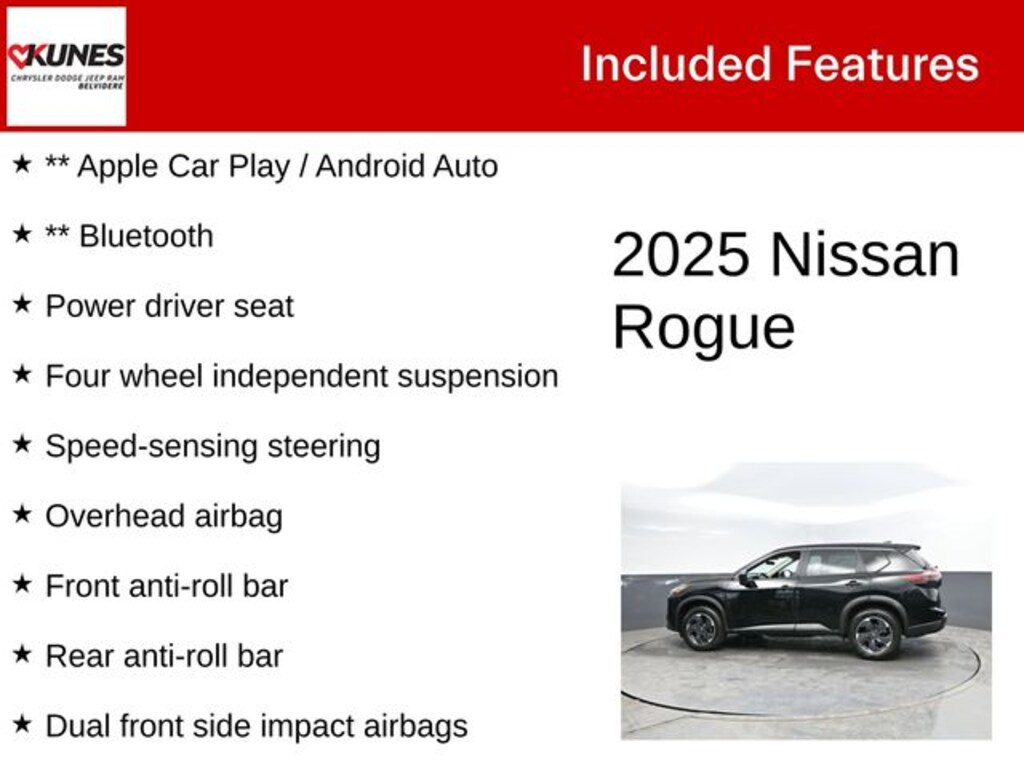 Recent Arrival! 2025 Nissan Rogue SV AWD ** Apple Car Play / Android Auto, ** Bluetooth, Alloy wheels, Cloth Seat Trim with Patterned Inserts, Delay-off headlights, Dual front side impact airbags, Four wheel independent suspension, Front anti-roll bar, Front Bucket Seats with 8-Way Power Driver Seat, Knee airbag, Occupant sensing airbag, Overhead airbag, Power driver seat, Rear anti-roll bar, Rear seat center armrest, Rear side impact airbag, Speed-sensing steering, Split folding rear seat, Spoiler, Variably intermittent wipers.