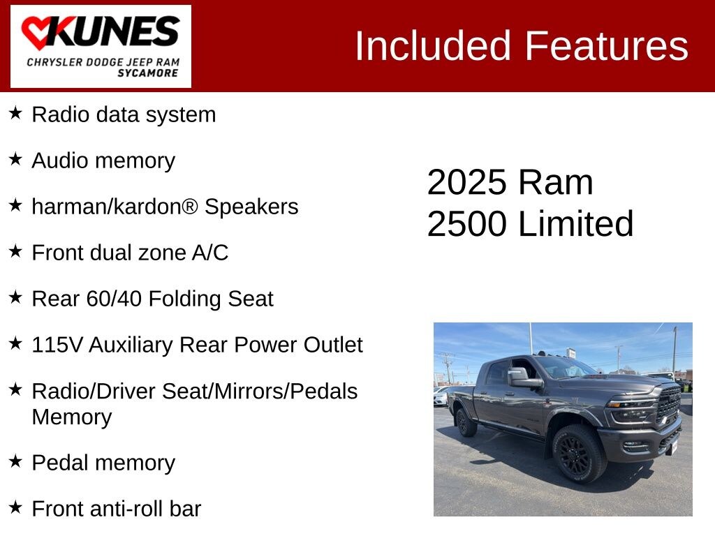 Discover the true essence of a premium pickup truck in the 2025 Ram 2500 Limited 4X4 MEGACAB. Visit our showroom and let us demonstrate why this remarkable vehicle is the perfect choice for your lifestyle.