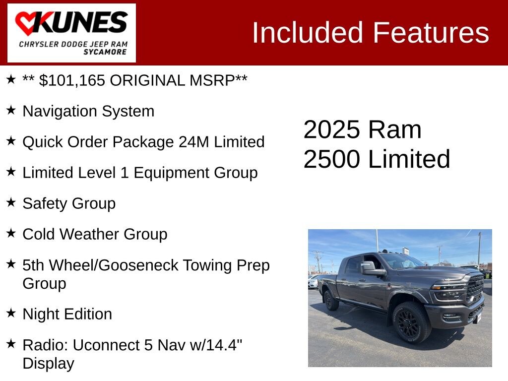 Discover the epitome of power, capability, and refined luxury in the 2025 Ram 2500 Limited 4X4 MEGACAB. This exceptional vehicle boasts an impressive $101,165 original MSRP, showcasing its unparalleled craftsmanship and premium features.