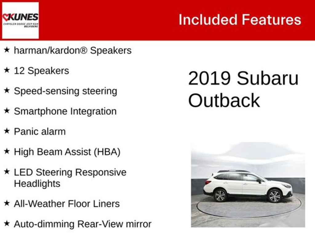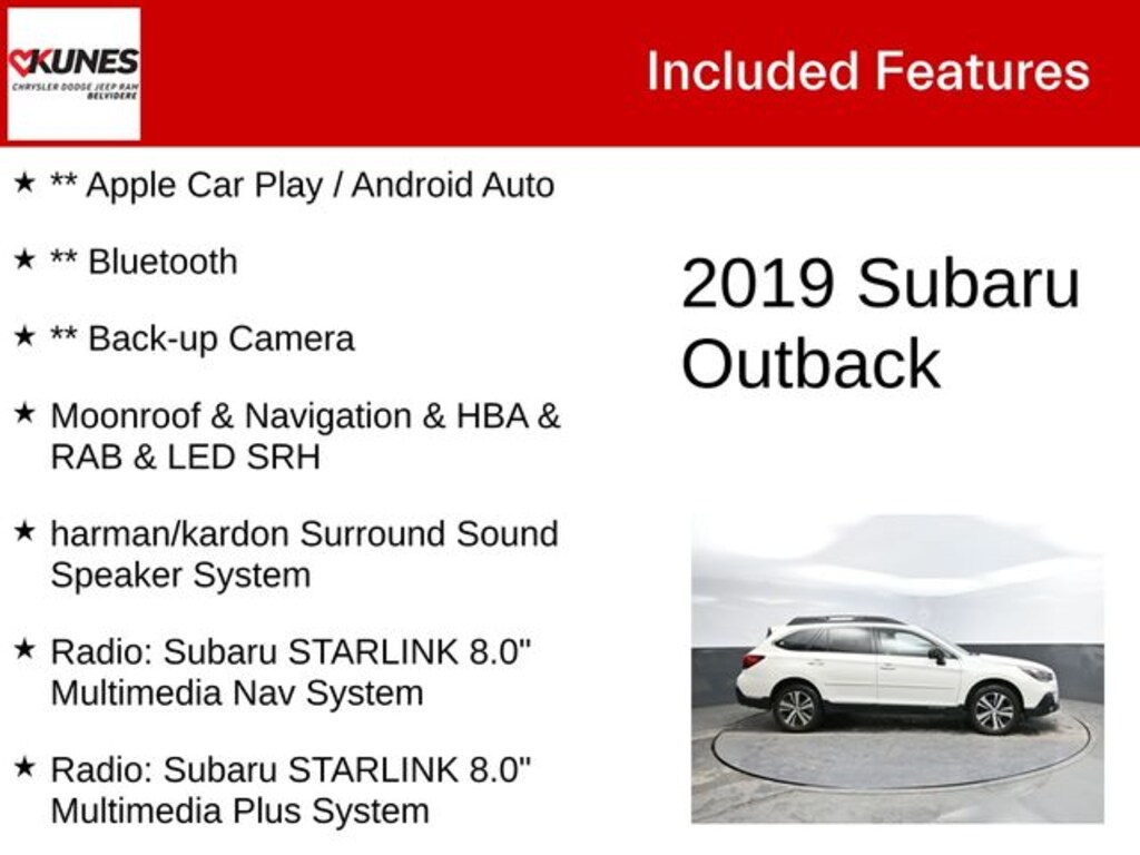 When our Honda CRV was totaled by an idiot in a pick up truck, we started shopping around. We examined all the other alternatives from Ford, GM, Honda, Toyota, Nissan, Hyundai, but it was when the Outback was taken for a test drive it IMMEDIATLY set itself apart from its competitors! Road noise, minimal; interior comfort, OUTSTANDING; road handling, a dream; electronics, mind-blowing array including safety systems; ALSO, and you cannot find this on ANY 2019 SUV in it's class, a CD PLAYER in addition to the satellite and broadcast radio! Yep, a physical real CD player, which means we don't have to put all our music on USB sticks! Ours is the 4 cylinder model, but even still, when you kick down on the accelerator (not the paddle switch on the steering wheel) it can deliver some very impressive acceleration! The back is absolutely cavernous compared to its competition, even before you put the rear seats in a down position! The array of controls available on the steering wheel is impressive to say the least, and will take a bit of learning to get fully comfortable with. When you consider ALL of the standard features, including safety features, that are extra on most of its competition, together with how the vehicle itself performs, this really is a no brainer! Detroit has a LOT of catching up to do, & mainstream Japan automakers, while maybe having the same technology, don't even come close to this level of appointments as standard at this price point!… - 5.0