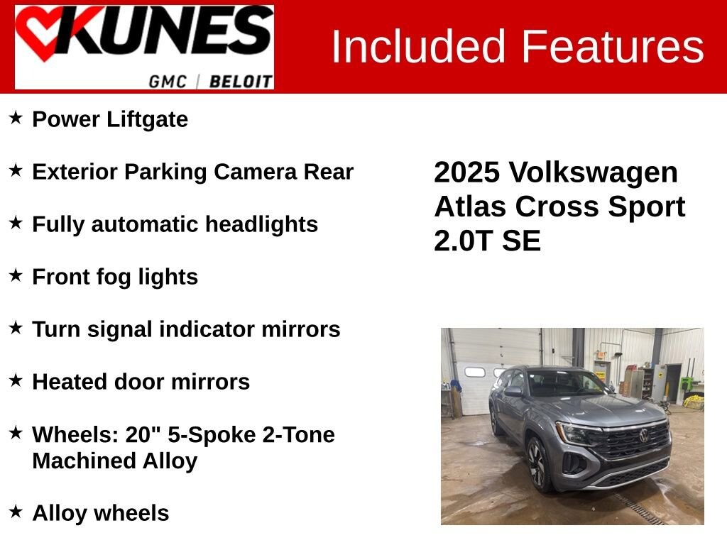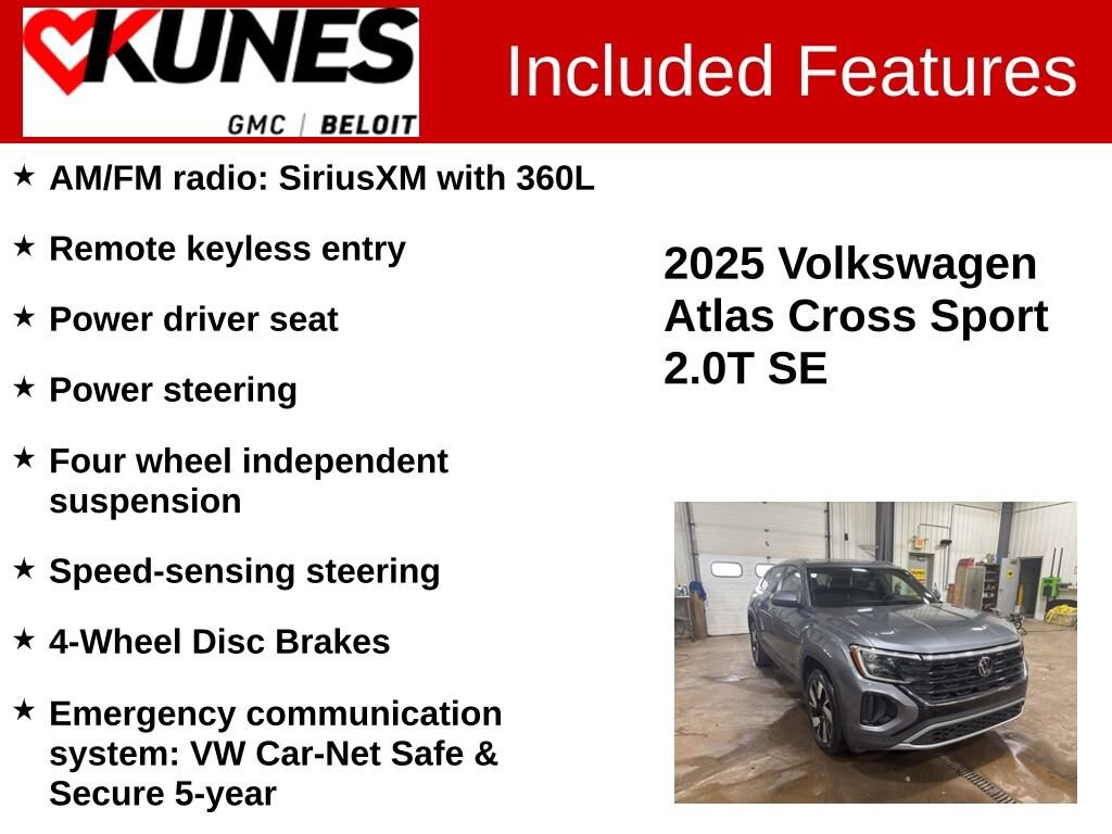 Recent Arrival! 4D Sport Utility 2025 Volkswagen Atlas Cross Sport 2.0T SE w/Technology Gray AWD 8-Speed Automatic with Tiptronic 2.0L TSI CARFAX One-Owner. Clean CARFAX. Atlas Cross Sport 2.0T SE w/Technology (A8), 2.0L TSI, AWD, 4-Wheel Disc Brakes, Alloy wheels, AM/FM radio: SiriusXM with 360L, Emergency communication system: VW Car-Net Safe & Secure 5-year, Exterior Parking Camera Rear, Four wheel independent suspension, Front fog lights, Fully automatic headlights, Heated door mirrors, Power driver seat, Power Liftgate, Power steering, Remote keyless entry, Speed-sensing steering, Turn signal indicator mirrors, Wheels: 20 5-Spoke 2-Tone Machined Alloy.