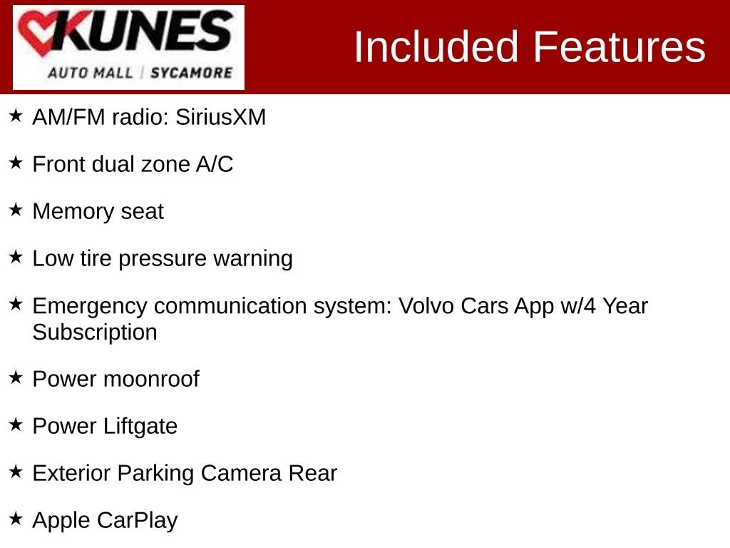 2025 Volvo XC60 B5 Plus AM/FM radio: SiriusXM, Apple CarPlay, Emergency communication system: Volvo Cars App w/4 Year Subscription, Exterior Parking Camera Rear, Front dual zone A/C, Heated Front Bucket Seats, Low tire pressure warning, Memory seat, Power Liftgate, Power moonroof.